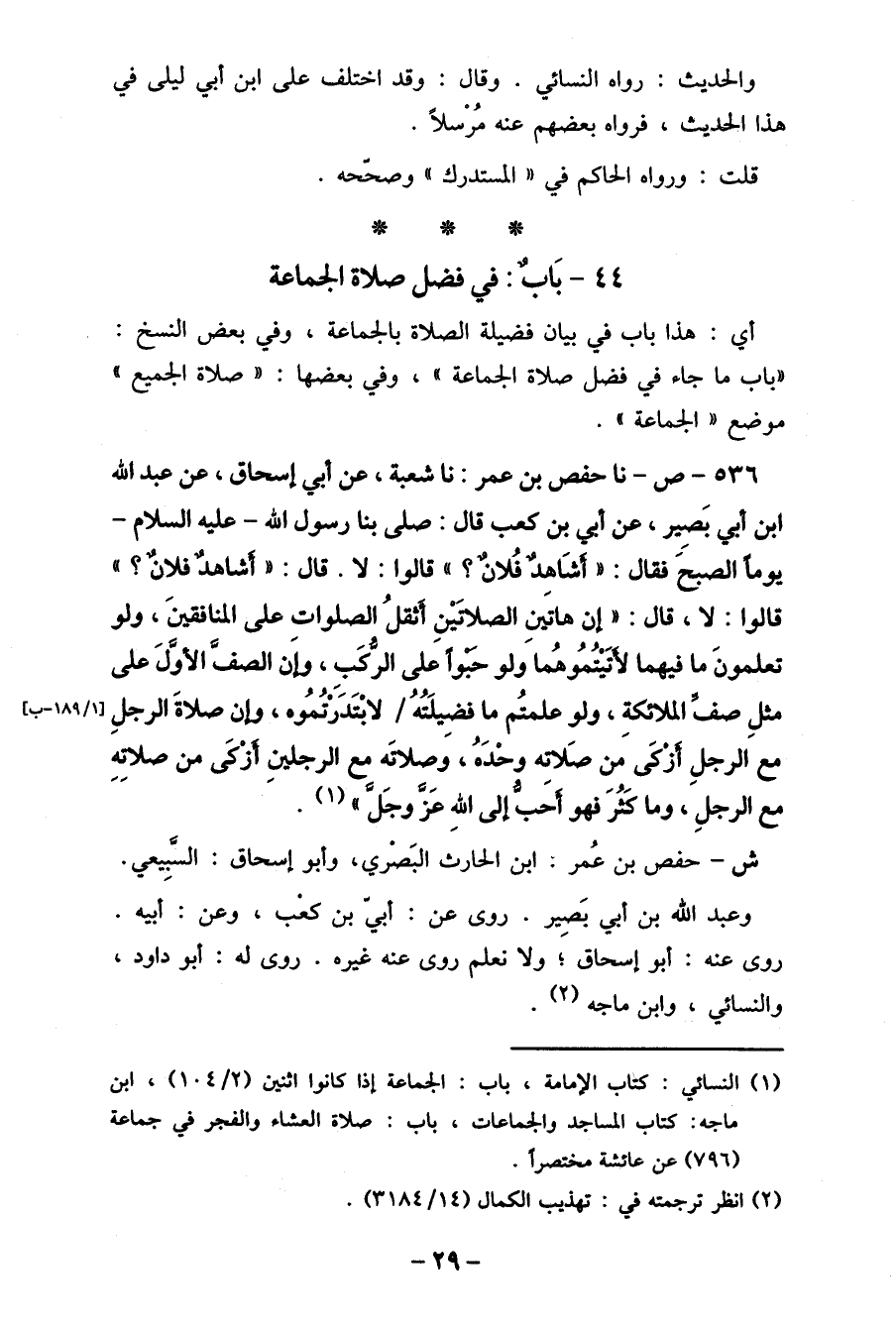 (1) النسائي: كتاب الإمامة، باب: الجماعة إذا كانوا اثنين (2 / 104) ، ابن ماجه: كتاب المساجد والجماعات، باب: صلاة العشاء والفجر في جماعة (796) عن عائشة مختصراً