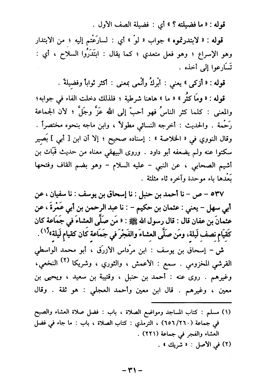 537- ص- نا أحمد بن حنبل: نا إسحاق بن يوسف: نا سفيان، عن أبي سهل- يعني: عثمان بن حكيم-: نا عبد الرحمن بن أبي عَمْرةَ، عن عثمانَ بن عفان قال: قال رسول الله صلى الله عليه وسلم: " مَن صَلى العشاءَ في جَمَاعة كان كَقِيَام نِصفِ لَيلةٍ، ومَن صَلى العِشاءَ والفَجْرَ في جَمَاعةٍ كَان كقيام لَيلةٍ " (1)