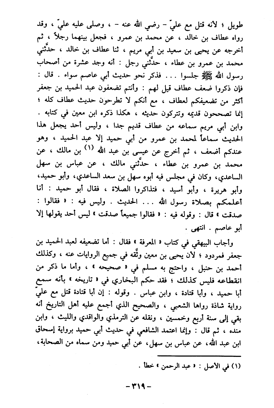 طويل، لأنه قتل مع علي- رضي الله عنه-، وصلى علي علي، وقد رواه عطاف بن خالد، عن محمد بن عمرو، فجعل بينهما رجلاً، ثم أخرجه عن يحمى بن سعيد بن أبي مريم، ثنا عطاف بن خالد، حدثني محمد بن عمرو بن عطاء، حدثني رجل: أنه وجد عشرة من أصحاب رسول الله صلى الله عليه وسلم جلسوا ... فذكر نحو حديث أبي عاصم سواء. قال: فإن ذكروا ضعف عطاف قيل لهم: وأنتم تضعفون عبد الحميد بن جعفر كثر من تضعيفكم لعطاف، مع أنكم لا تطرحون حديث عطاف كله، إنما تصححون قديمه وتتركون حديثه، هكذا ذكره ابن معين في كتابه. وابن أبي مريم سماعه من عطاف قديم جدا، وليس أحد يجعل هذا الحديث سماعاً لمحمد بن عمرو من أبي حميد إلا عبد الحميد، وهو عندكم أضعف، ثم أخرج عن عيسى بن عبد الله (1) بن مالك، عن محمد بن عمرو بن عطاء، حدثني مالك، عن عباس بن سهل الساعدي، وكان في مجلس فيه أبوه سهل بن سعد الساعدي، وأبو حميد، وأبو هريرة، وأبو أسيد، فتذاكروا الصلاة، فقال أبو حميد: أنا أعلمكم بصلاة رسول الله ... الحديث. وليس فيه: " فقالوا: صدقت " قال: وقوله فيه: " فقالوا جميعاً صدقت " ليس أحد يقولها إلا أبو عاصم. انتهى.