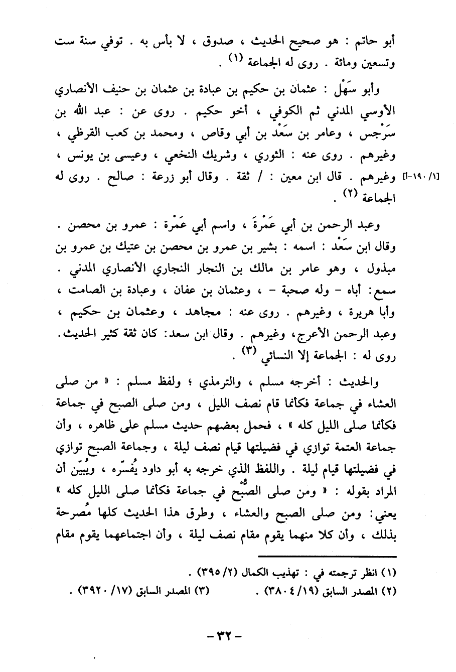 والحديث: أخرجه مسلم، والترمذي، ولفظ مسلم: "من صلى العشاء في جماعة فكأنما قام نصف الليل، ومن صلى الصبح في جماعة فكأنما صلى الليل كله"، فحمل بعضهم حديث مسلم على ظاهره، وأن جماعة العتمة توازي في فضيلتها قيام نصف ليلة، وجماعة الصبح توازي في فضيلتها قيام ليلة. واللفظ الذي خرجه به أبو داود يُفسره، ويُبين أن المراد بقوله: " ومن صلى الملمح في جماعة فكأنما صلى الليل كله " يعني: ومن صلى الصبح والعشاء، وطرق هذا الحديث كلها مُصرحة بذلك، وأن كلا منهما يقوم مقام نصف ليلة، وأن اجتماعهما يقوم مقام