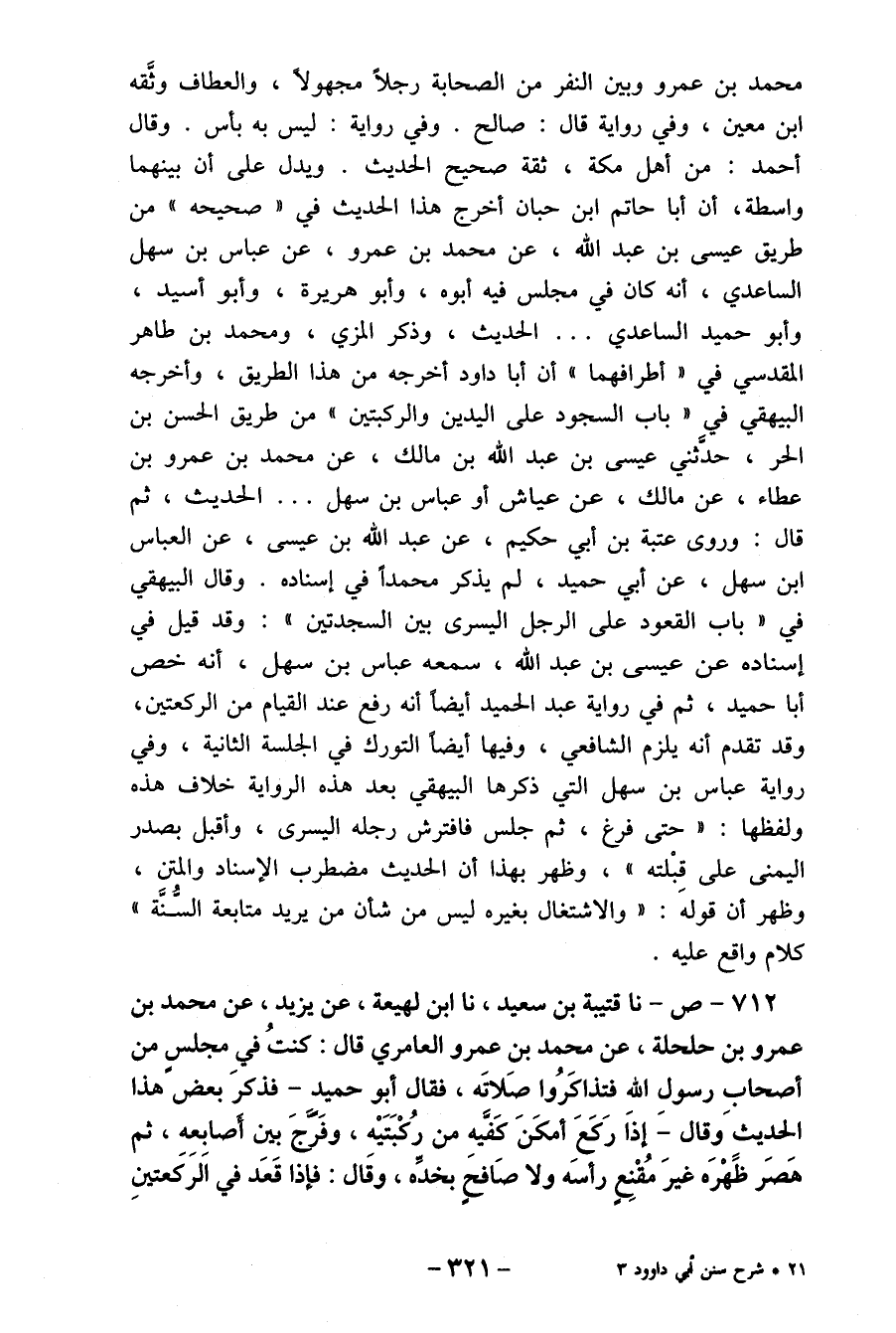 712- ص- نا قتيبة بن سعيد، نا ابن لهيعة، عن يزيد، عن محمد بن عمرو بن حلحلة، عن محمد بن عمرو العامري قال: كنتُ في مجلسٍ من أصحاب رسول الله فتذاكَرُوا صَلاتَه، فقال أبو حميد- فذكرَ بعض هذا الحديثَ وقال- إذا رَكَعَ أمكَنَ كَفيه من رُكْبَتَيْه، وفَرج بين أصابعه، ثم هَصَر ظًهْرَه غيرَ مُقْنِعٍ رأسه ولا صَافحٍ بخدهِّ، وقَال: فإذا قَعَد في اَلرَكَعتينِ