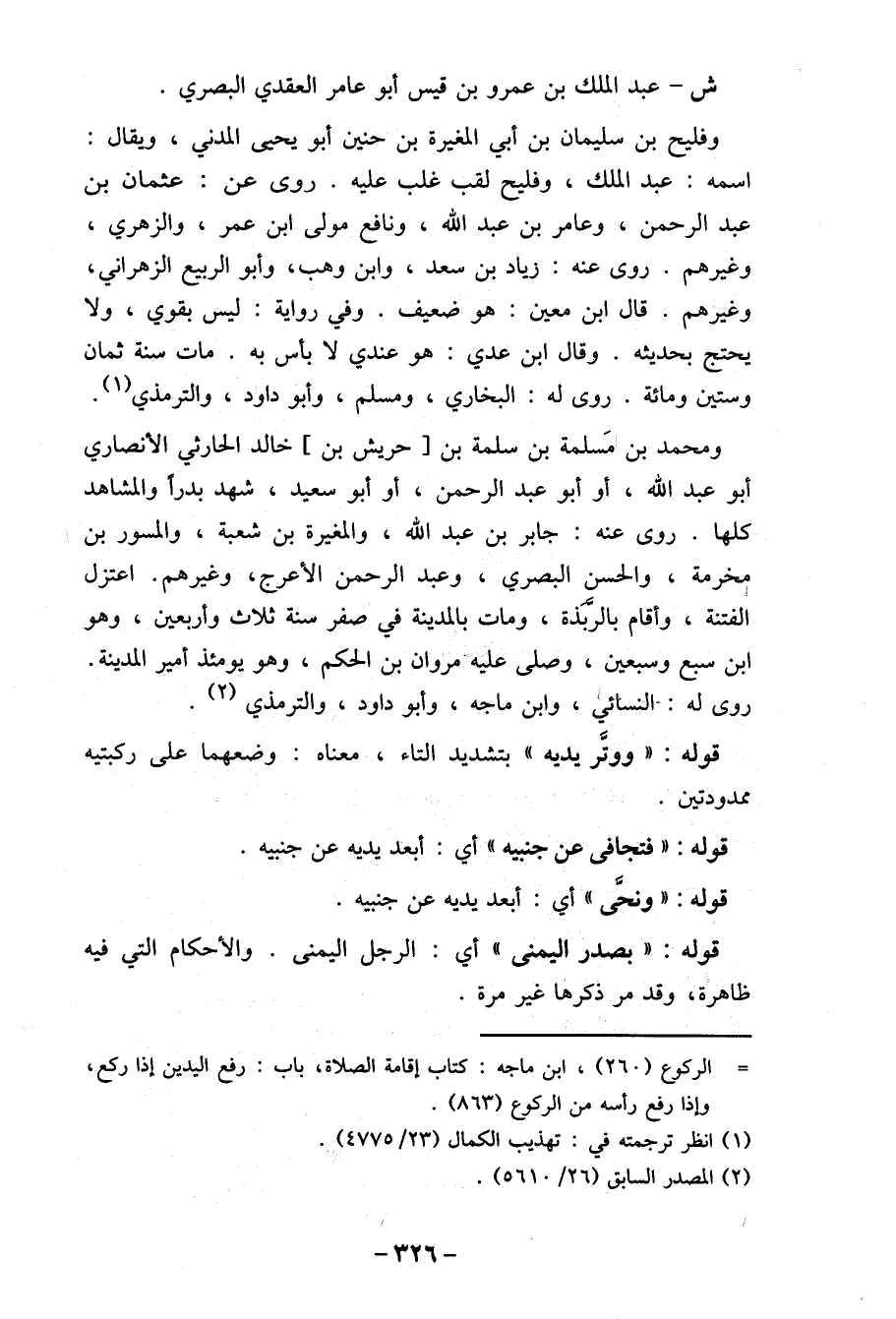 وفليح بن سليمان بن أبي المغيرة بن حنين أبو يحيى المدني، ويقال: اسمه: عبد الملك، وفليح لقب غلب عليه. روى عن: عثمان بن عبد الرحمن، وعامر بن عبد الله، ونافع مولى ابن عمر، والزهري، وغيرهم. روى عنه: زياد بن سعد، وابن وهب، وأبو الربيع الزهراني، وغيرهم. قال ابن معين: هو ضعيف. وفي رواية: ليس بقوي، ولا يحتج بحديثه. وقال ابن عدي: هو عندي لا بأس به. مات سنة ثمان وستين ومائة. روى له: البخاري، ومسلم، وأبو داود، والترمذي (1) . ومحمد بن مَسلمة بن " حريش بن "، خالد الحارثي الأنصاري أبو عبد الله، أو أبو عبد الرحمن، أو أبو سعيد، شهد بدرا والمشاهد كلها. روى عنه: جابر بن عبد الله، والمغيرة بن شعبة، والمسور بن مخرمة، والحسن البصري، وعبد الرحمن الأعرج، وغيرهم. اعتزل الفتنة، وأقام بالربذة، ومات بالمدينة في صفر سنة ثلاث وأربعين، وهو ابن سبع وسبعين، وصلى علي. مروان بن الحكم، وهو يومئذ أمير المدينة. روى له: " النسائي، وابن ماجه، وأبو داود، والترمذي (2) .