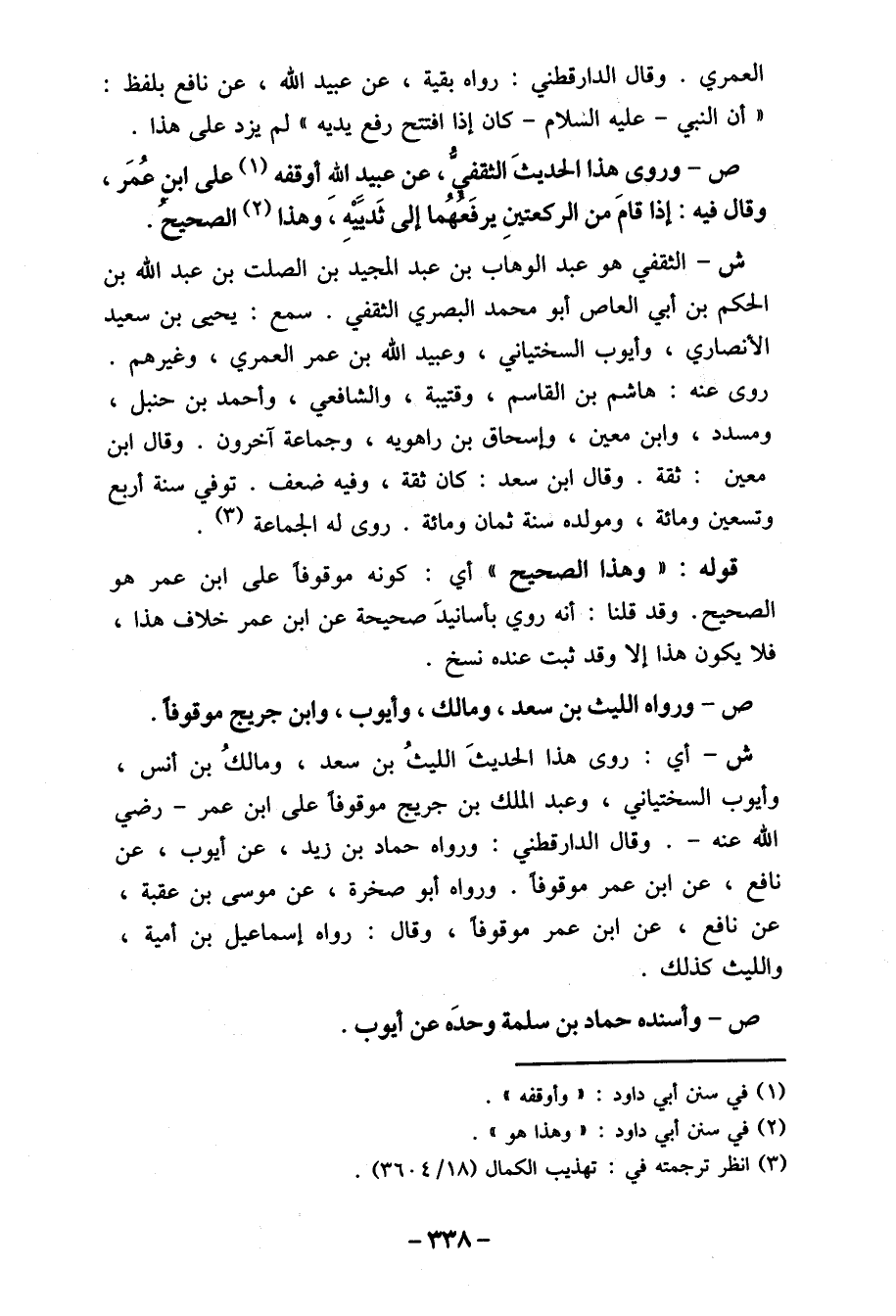 ش- أي: روى هذا الحديثَ الليثُ بن سعد، ومالكُ بن أنس، وأيوب السختياني، وعبد الملك بن جريج موقوفا على ابن عمر- رضي الله عنه-. وقال الدارقطني: ورواه حماد بن زيد، عن أيوب، عن نافع، عن ابن عمر موقوفا. ورواه أبو صخرة، عن موسى بن عقبة، عن نافع، عن ابن عمر موقوفا، وقال: رواه إسماعيل بن أمية، والليث كذلك.