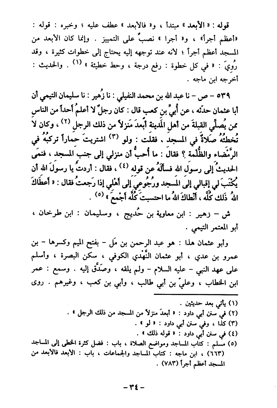 539- ص- نا عبد الله بن محمد النفيلي: نا زُهير: نا سليمان التيمي أن أبا عثمان حدثه، عن أيِّ بنِ كعب قال: كان رجل لا أعلمُ أحداً من الناسِ ممن يُصلي القبلةَ من أهلِ المَدينة أبًعدَ مَنزلاً من ذلك الرجلِ (2) ، وكان لا تُخطئُهُ صَلاة في المسجد فقلَت: ولو (3) اشتريتَ حمارا تركبُهُ في الرَّمْضَاء والظلمة؟ فقالَ: ما أحب أن منزلي إلى جنبَ المسجدِ، فنمَى الحديثَُ إلى رسوَل الله فسألَهُ عن قولِه (4) ، فقال: أردت" يا رسولَ الله أن يكْتَبَ لي إقبالي إلي المسجد ورُجُوعِي إلى أَهْلِي إذا رَجعتُ فقال: " أعطًاكَ اللهُ ذَلك كُله، أنطاك اللهُ ما احتسبتَ كُله أَجْمعَ" (5) .