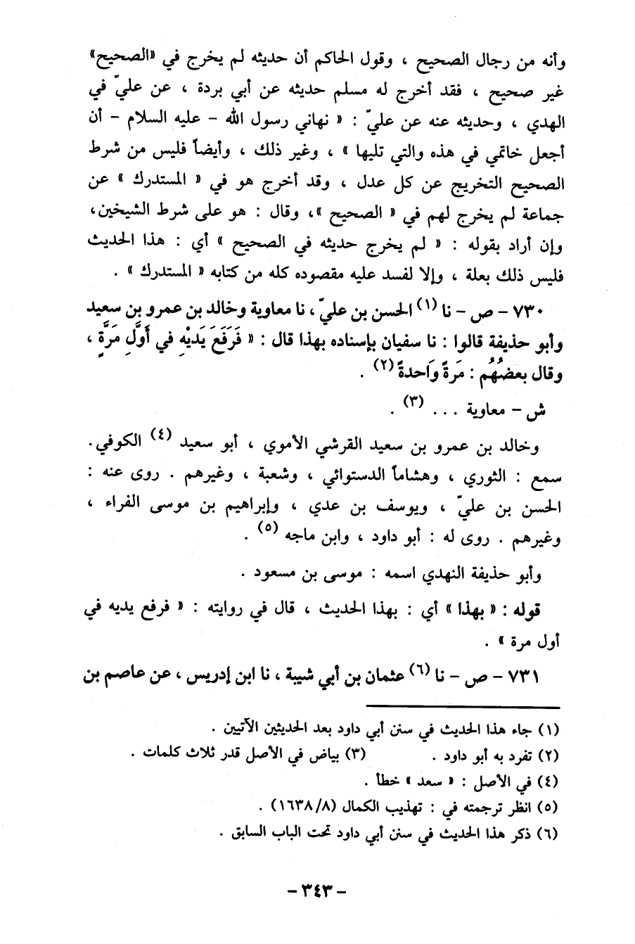 730- ص- نا (1) الحسن بن علي، نا معاوية وخالد بن عمرو بن سعيد وأبو حذيفة قالوا: نا سفيان لإسناده بهذا قال: " فَرَفَعَ يَديْهِ في أؤَلِ مَرةِ، وقال بعضُهُم: مَرةَ وَاحدةَ (2) .