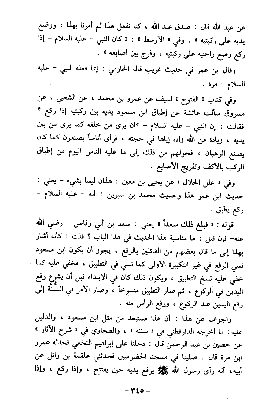 والجواب عن هذا: أن هذا مستبعد من مثل ابن مسعود، والدليل علي: ما أخرجه الدارقطني في " سننه "، والطحاوي في " شرح الآثار " عن حصين بن عبد الرحمن قال: دخلنا على إبراهيم النخعي فحدثه عمرو ابن مرة قال: صلينا في مسجد الحضرميين فحدثني القمة بن وائل عن أبيه، أنه رأى رسول الله صلى الله عليه وسلم يرفع يديه حين يفتتح، وإذا ركع، وإذا