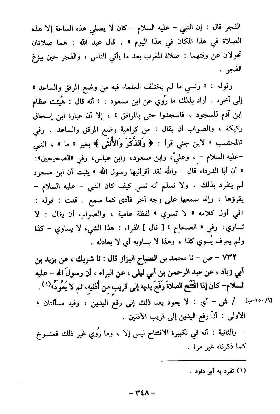أبي زياد، عن عبد الرحمن بن أبي ليلى، عن البراء، أن رسولَ الله- عليه السلام- كان إذا افْتَتَح الصلاة رَفَعَ يديه إلى قريب مِن أذنيهِ، ثم لا يَعُوَد " (1) . [1/250-ب] /ش- أي: لا يعود بعد ذلك إلى رفعَ اليدين، وفيه مسألتان، الأولى: أن رفع اليدين إلى قريب الأذنين.