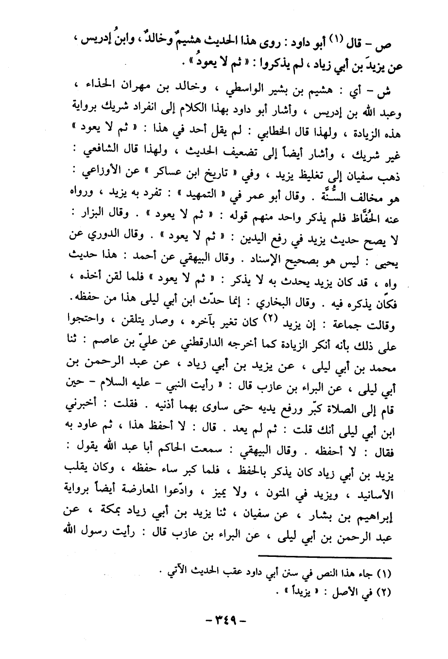 ش- أي: هشيم بن بشير الواسطي، وخالد بن مهران الحذاء، وعبد الله بن إدريس، وأشار أبو داود بهذا الكلام إلى انفراد شريك برواية هذه الزيادة، ولهذا قال الخطابي: لم يقل أحد في هذا: "ثم لا يعود " غير شريك، وأشار أيضاً إلى تضعيف الحديث، ولهذا قال الشافعي: ذهب سفيان أي تغليظ يزيد، وفي " تاريخ ابن عساكر " عن الأوزاعي: هو مخالف السّنَة. وقال أبو عمر في " التمهيد ": تفرد به يزيد، ورواه عنه الحُفاظ فلم يذكر واحد منهم قوله: " ثم لا يعود ". وقال البزار: لا يصح حديث يزيد في رفع اليدين: " ثم لا يعود ". وقال الدوري عن يحيى: ليس هو بصحيح الإسناد. وقال البيهقي عن أحمد: هذا حديث واه، قد كان يزيد يحدث به لا يذكر: "ثم لا يعود " ف" لقن أخذه، فكاًن يذكره فيه. وقال البخاري: إنما حدث ابن أبي ليلى هذا من حفظه. وقالت جماعة: إن يزيد (2) كان تغير بآخره، وصار يتلقن، واحتجوا على ذلك بأنه أنكر الزيادة كما أخرجه الدارقطني عن علي بن عاصم: ثنا محمد بن أبي ليلى، عن يزيد بن أبي زياد، عن عبد الرحمن بن أبي ليلى، عن البراء بن عازب قال: " رأيت النبي- عليه السلام- حين قام إلى الصلاة كبر ورفع يديه حتى ساوى بهما أذنيه. فقلت: أخبرني ابن أبي ليلى أنك قلت: ثم لم يعد. قال: لا أحفظ هذا، ثم عاود به فقال: لا أحفظه. وقال البيهقي: سمعت الحاكم أبا عبد الله يقول، يزيد بن أبي زياد كان يذكر بالحفظ، ف" كبر ساء حفظه، وكان يقلب الأسانيد، ويزيد في المتون، ولا يميز، وادعوا المعارضة أيضاً برواية إبراهيم بن بشار، عن سفيان، ثنا يزيد بن أبي زياد بمكة، عن عبد الرحمن بن أبي ليلى، عن البراء بن عازب قال: رأيت رسول الله