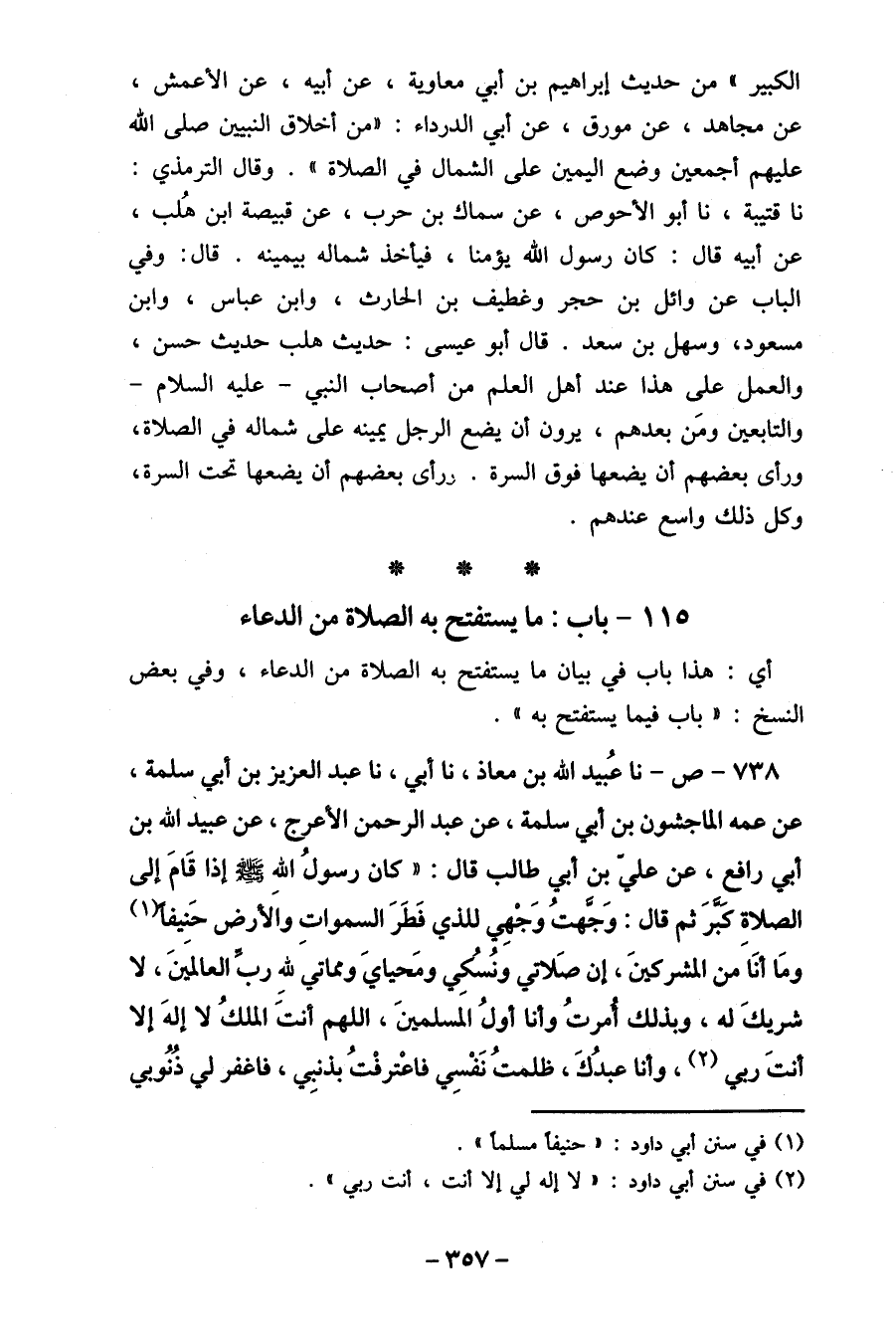 738- ص- نا عُبيد الله بن معاذ، نا أبي، نا عبد العزيز بن أبي سلمة، عن عمه الماجشون بن أبي سلمة، عن عبد الرحمن الأعرج، عن عبيد الله بن أبي رافع، عن على بن أبي طالب قال: " كان رسولُ الله صلى الله عليه وسلم إذا قَامَ إلى الصلاة كبرَ ثم قال: وَجهتُ وَجْهِي للذي فَطَرَ السمواتِ واَلأرض حنيفا (1) ومَا أنَاَ من المشركينَ، إن صَلاتي ونُسُكِي ومَحيايَ ومماتي لله رب العالمَينَ، لا شريكَ له، وبذلك أمرتُ وأنا أولُ المسلمينَ، اللهم أنت الملكُ لا إلهَ إلا أنتَ ربي (2) ، وأنا عبدُكَ، ظلمتُ نَفْسِي فاعْترفْتُ بذنبِي، فاغفر لي ذُنُوبي