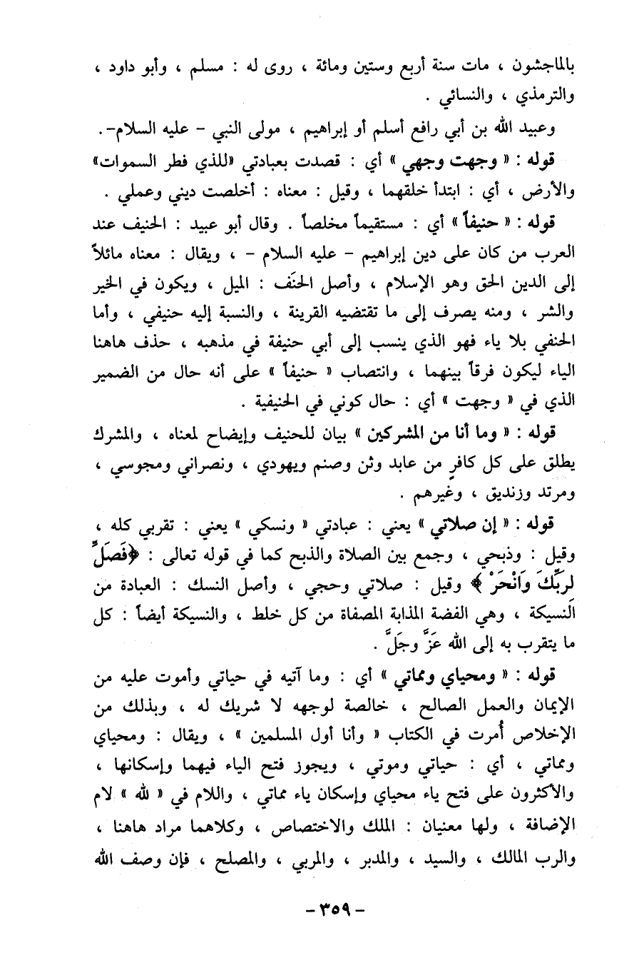 قوله: " إن صلاتي " يعني: عبادتي" ونسكي " يعني: تقربي كله، وقيل: وذبحي، وجمع بين الصلاة والذبح كما في قوله تعالى: (فَصَل لرَبّكَ وَانْحَرْ) وقيل: صلاتي وحجي، وأصل النسك: العبادة من الَنسيكة، وهي الفضة المذابة المصفاة من كل خلط، والنسيكة أيضاً: كل ما يتقرب به إلى الله عَز وجَل.