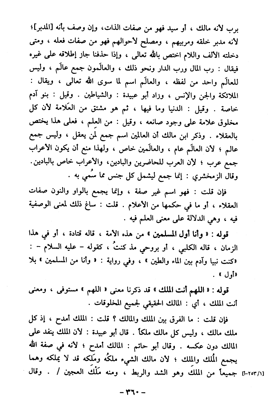 برب لأنه مالك، أو سيد فهو من صفات الذات، وإن وصف بأنه [المدبر] ، لأنه مدبر خلقه ومربيهم، ومصلح لأحوالهم فهو من صفات فعله، ومتى دخلته الألف واللام اختص بالله تعالى، وإذا حذفنا جار إطلاقه على غيره فيقال: رب ا"ل ورب الدار ونحو ذلك، والعالَمون جمع عالَم، وليس للعالَم واحد من لفظه، والعالَم اسم " سوى الله تعالى، ويقال: الملائكة والجن والإنس، وزاد أبو عبيدة: والشياطين. وقيل: بنو آدم خاصة. وقيل: الدنيا وما فيها، ثم هو مشتق من العَلامة لأن كل مخلوق علامة على وجود صانعه، وقيل: من العِلم، فعلى هذا يختص بالعقلاء. وذكر ابن مالك أن العالمين اسم جمع لمن يعقل، وليس جمع عالم، لأن العالَم عام، والعالَمين خاص، ولهذا منع أن يكون الأعراب جمع عرب، لأن العرب للحاضرين والبادين، والأعراب خاص بالبادين. وقال الزمخشري: إنما جمع ليشمل كل جنس مما سُمي به.