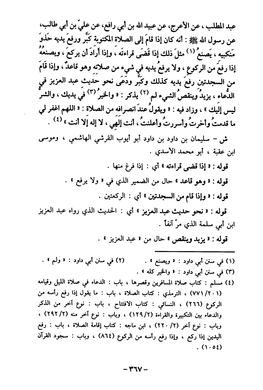 عبد المطلب، عن الأعرج، عن عبيد الله بن أي رافع، عن عليّ بن أبي طالب، عن رسول الله صلى الله عليه وسلم: أنه كان إذا قامَ إلى الصلاة المكتوبة كَبر ورفعَ يديه حَذوَ مَنكبيه، يَصنعُ (1) مثلَ ذلك إذا قَضَى قراءتَه، وإذا أرَادَ أن يركعَ، ويصنعُهُ إذا رفعً من الركوع، ولا يرفعُ يديه في شيء من صلاِتهِ وهو قاعا، وإذا قَامَ من السجدتين رفعَ يديه كذلك وكَبر ودَعَى نحو حديث عبد العزيز في الدعاء، يزيدُ وينقصُ الشيء لم (2) يذكر: " والخير (3) في يديك، والشر ليس إلَيك"، وزاد فيه: " وبقولُ عندَ انصرافه من الصلاة: " اللهم اغفر لي ما قدمتُ وأخرتُ وأسررتُ وأعلنتُ، أنت إلَهَي، لا إله إَلا أنت " (4) . ش- سليمان بن داود بن داود أبو أيوب القرشي الهاشمي، وموسى ابن عقبة، أبو محمد الأسدي.