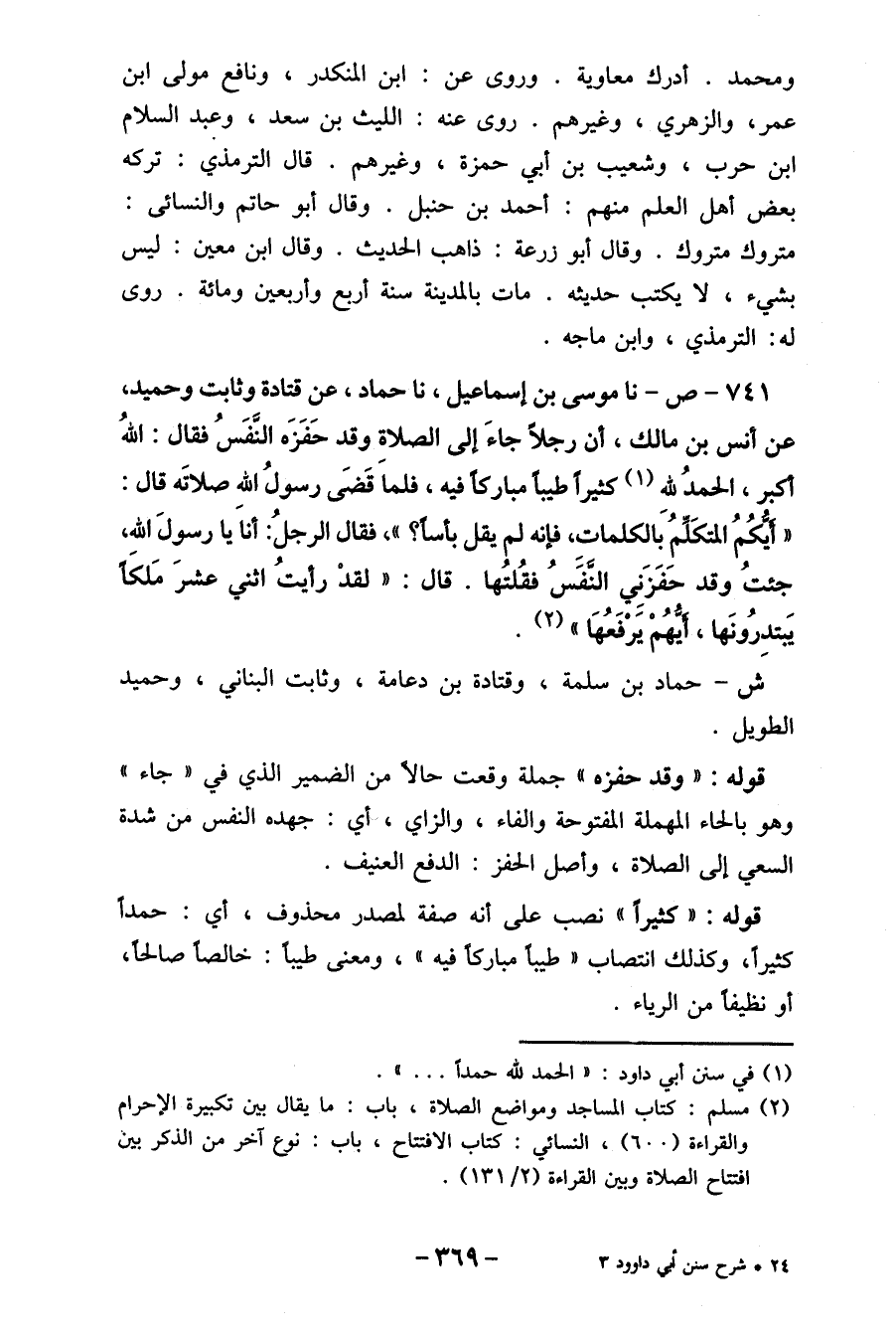 741- ص -نا موسى ابن إسماعيل نا حماد عن قتادة وثابت وحميد، عن أنس ابن مالك، أن رجلا جاء إلى الصلاة وقد حفزه النفس فقال: الله أكبر، والحمد لله (1) كثيرا طيبا مباركا فيه، ف" قضى رسول الله صلاته قال: " أيكم المتكلم بالك"ت، فإنه لم بقل بأسا؟ "، فقال: أنا يا رسول الله جئت وقد حفزني النفس فقالتها. قال: " لقد رأيت اثنى عشر ملكا يبتدرونها أيهم يرفعها "