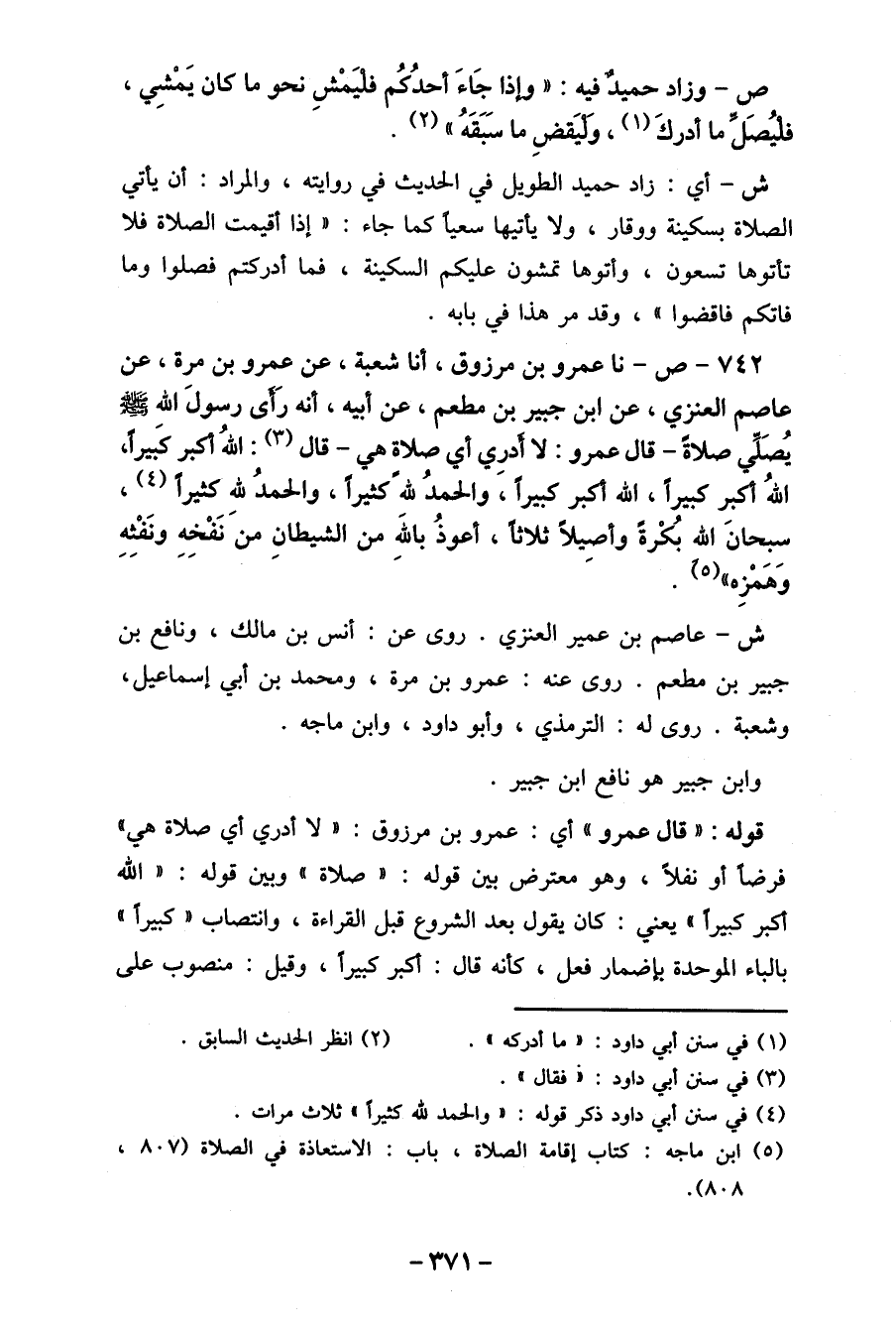 742 - ص - نا عمرو بن مرزوق، أنا شعبة، عن عمرو بن مرة عن عاصم العنزي، عن ابن جبير بن مطعم عن أبيه أنه رأى رسول الله صلى الله عليه وسلم يصلي الصلاة - قال عمرو: لا أدري أي صلاة هي - قال (3) : الله أكبر كبيرا، الله أكبر كبيرا، والحمد لله كثيرا، والحمد لله كثيرا، والحمد لله كثيرا، والحمد لله كثيرا (4) ، سبحان الله بكرة وأصيلا ثلاثا أعوذ بالله من الشيطان من نفخه ونفثه وهمزه " (5)