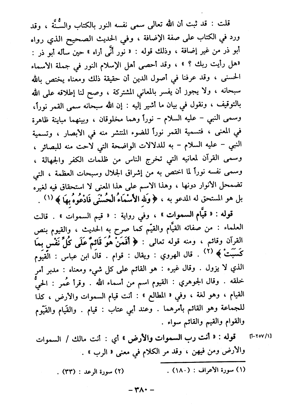 ورد في الكتاب على صفة الإضافة، وفي الحديث الصحيح الذي رواه أبو ذر من غير إضافة، وذلك قوله: " نور أنى أراه " حين سأله أبو ذر: "هل رأيت ربك؟ "، وقد أحصى أهل الإسلام النور في جملة الأسماء الحسنى، وقد عرفنا في أصول الدين أن حقيقة ذلك ومعناه يختص بالله سبحانه، ولا يجوز أن يفسر بالمعاني المشتركة، وصح لنا إطلاقه على الله بالتوقيف، ونقول في بيان ما أشير إليه: إن الله سبحانه سمى القمر نوراً وسمى النبي- عليه السلام- نورا وهما مخلوقان، وبينهما مباينة ظاهرة في المعنى، فتسمية القمر نورا للضوء المنتشر منه في الأبصار، وتسمية النبي- عليه السلام- به للدلالات الواضحة التي لاحت منه للبصائر، وسمى القرآن لمعانيه التي تخرج الناس من ظلمات الكفر والجهالة، وسمى نفسه نورا " اختص به من إشراق الجلال وسبحات العظمة، التي تضمحل الأنوار دونها، وهذا الاسم على هذا المعنى لا استحقاق فيه لغيره بل هو المستحق له المدعو به، (وللهِ الأسْمَاءُ الحُسْنَى فَادْعُوه ُبِهَا) (1) . قوله: " قيام السموات "، وفي رواية:" قيم السموات" قالت العلماء: من صفاته القيَام والقيم كما صرح به الحديث، والقيوم بنص القرآن وقائم، ومنه قوله تعالى: (أفَمَنْ هُوَ قَائم عَلَى كُلِّ نَفْس بمَا كَسَبَتْ) (2) . قال الهروي: ويقال: قوام. قالَ ابن عباس، القيَوم الذي لا يزول. وقال غيره: هو القائم على كل شيء ومعناه: مدبر أمر خلقه. وقال الجوهري: القيوم اسم من أسماء الله. وقرأ عُمر: الحي القيام، وهو لغة، وفي" المطالع ": أنت قيام السموات والأرض، كذا للجماعة وهو القائم بأمرهما. وعند أبي عتاب: قيام. والقَيام والقَيوم والقوام والقيم والقائم سواء.