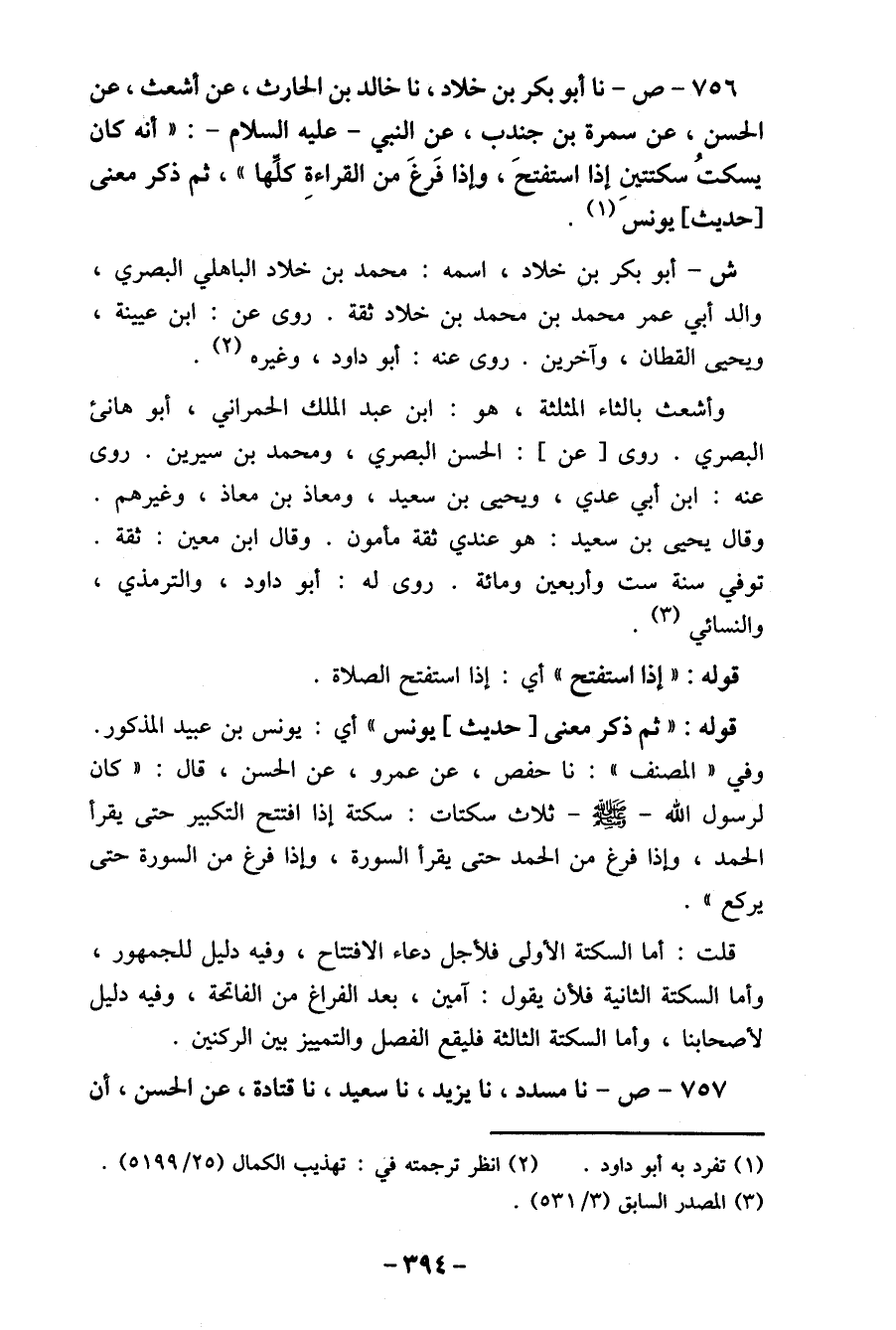 756- ص- نا أبو بكر بن خلاد، نا خالد بن الحارث، عن أشعث، عن الحسن، عن سمرة بن جندب، عن النبي- عليه السلام-: " أنه كان يسكتُ سكتتينِ إذا استفتحَ، وإذا فَرغَ من القراءةِ كلها "، ثم ذكر معنى [حديث] يونس (1) .