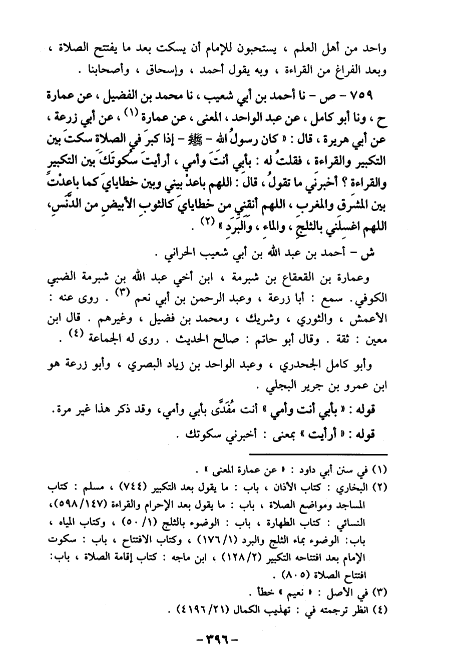 759- ص- نا أحمد بن أبي شعيب، نا محمد بن الفضيل، عن عمارة ح، ونا أبو كامل، عن عبد الواحد، المعنى، عن عمارة (1) ، عن أي زرعة، عن أبي هريرة، قال: " كان رسولُ الله- صلى الله عليه وسلم - إذا كبرَ في الصلاة سكتَ بين التكبير والقراءةِ، فقلتُ له: بأبي أنتم وأمي، ورأيت سكوتًَك التكبيرة والقراءة؟ أخبرني ما تقولُ، قالَ: اللهم باعدْ بيني وبن خطايايَ كما باعدْت بين المشرق والمغرب، اللهم أنقنِي من خطايايَ كالثوب الأبيضِ من الدنسِ، اللهم اغسِلَني بالثلجَ، والماءِ، وَالبَرَدِ " (2) .