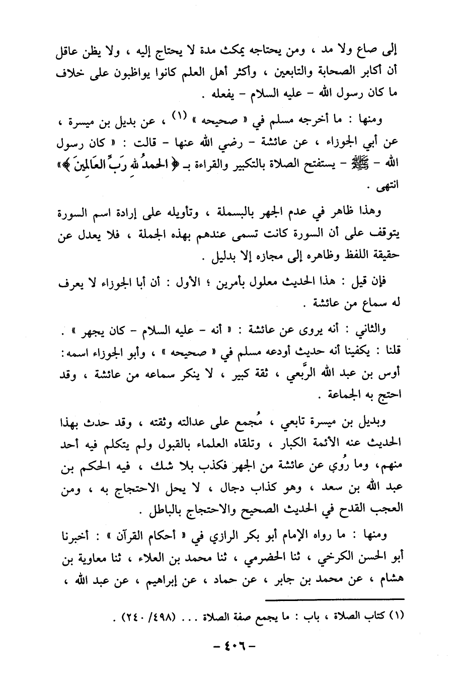عن أبي الجوزاء، عن عائشة- رضي الله عنها- قالت: " كان رسول الله- صلى الله عليه وسلم - يستفتح الصلاة بالتكبير والقراءة ب " الحمدُ لله رَبّ العَالمينَ " انتهى. َ