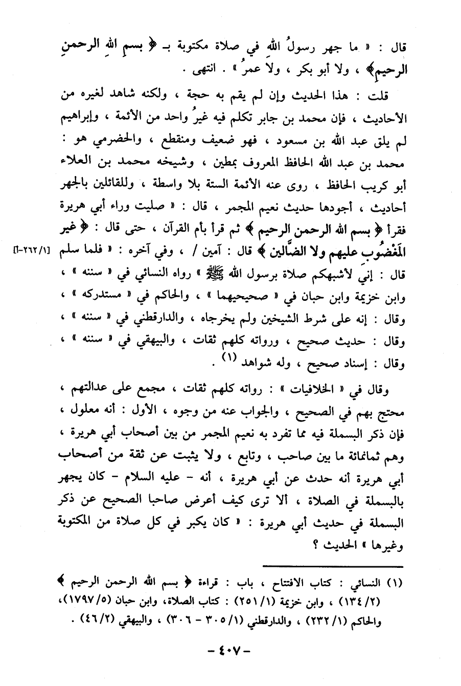 (1) النسائي: كتاب الافتتاح، باب: قراءة " بسم الله الرحمن الرحيم " (2 / 134) ، وابن خزيمة (1 /251) : كتاب الصلاة، وابن حبان (5 /1797) ،