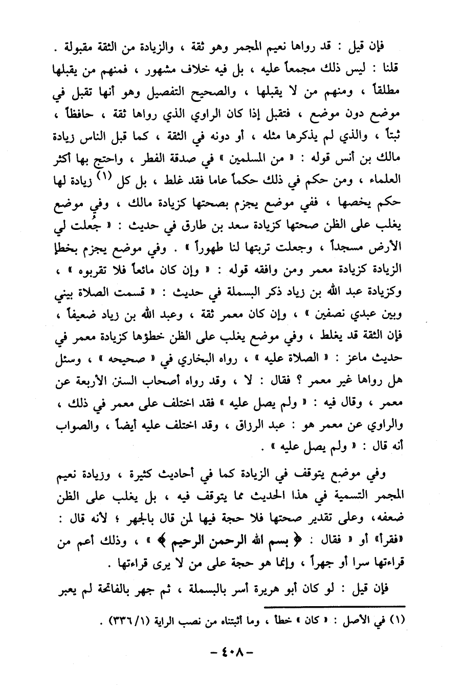 وفي موضع يتوقف في الزيادة كما في أحاديث كثيرة، وزيادة نعيم المجمر التسمية في هذا الحديث مما يتوقف فيه، بل يغلب على الظن ضعفه، وعلى تقدير صحتها فلا حجة فيها لمن قال بالجهر، لأنه قال: " فقرأ " أو" فقال: (بسم الله الرحمن الرحيم) ، وذلك أعم من قراءتها سرا أو جهرا، وإنما هو حجة على من لا يرى قراءتها.