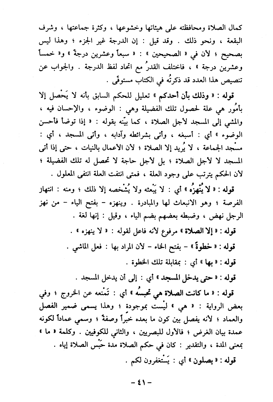 كمال الصلاة ومحافظته على هيئاتها وخشوعها، وكثرة جماعتها، وشرف البقعة، ونحو ذلك. وقد قيل: إن الدرجة غير الجزء، وهذا ليس بصحيح، لأن في " الصحيحين ": (سبعاً وعشرين درجة " و "خمساً وعشرين درجة "، فاختلف القدرُ مع اتحاد لفظ الدرجة. والجواب عن تنصيص هذا العدد قد ذكرتُه في الكتاب مستوفًى.