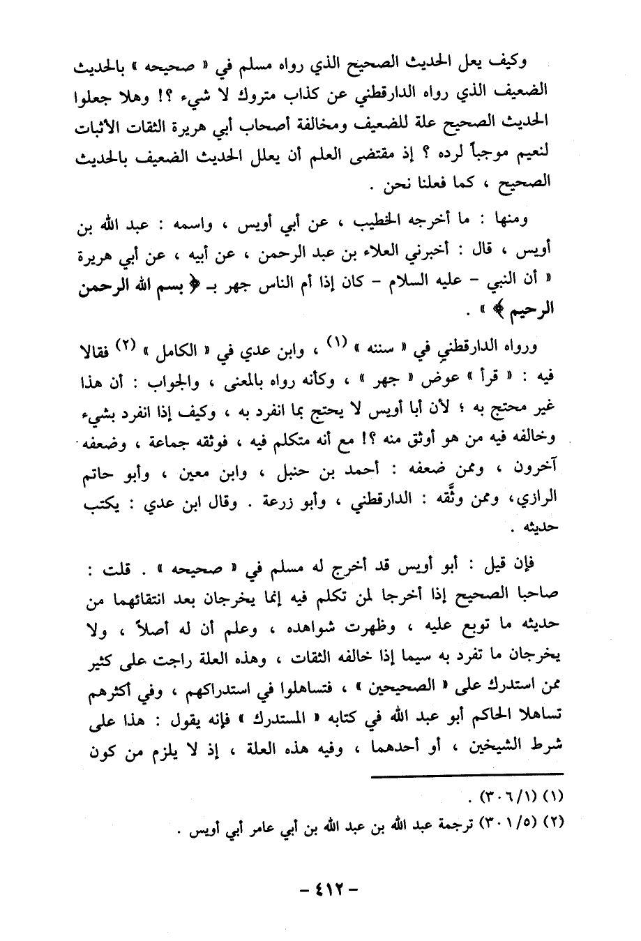 ورواه الدارقطني في " سننه " (1) ، وابن عدي في " الكامل " (2) فقالا فيه: " قرأ " عوض " جهر "، وكأنه رواه بالمعنى، والجواب: أن هذا غير محتج به، لأن أبا أويس لا يحتج بما انفرد به، وكيف إذا انفرد بشيء وخالفه فيه من هو أوثق منه؟ ! مع أنه متكلم فيه، فوثقه جماعة، وضعفهْ آخرون، وممن ضعفه: أحمد بن حنبل، وابن معين، وأبو حاتم الرازي، وممن وثقه: الدارقطني، وأبو زرعة. وقال ابن عدي: يكتب حديثه.