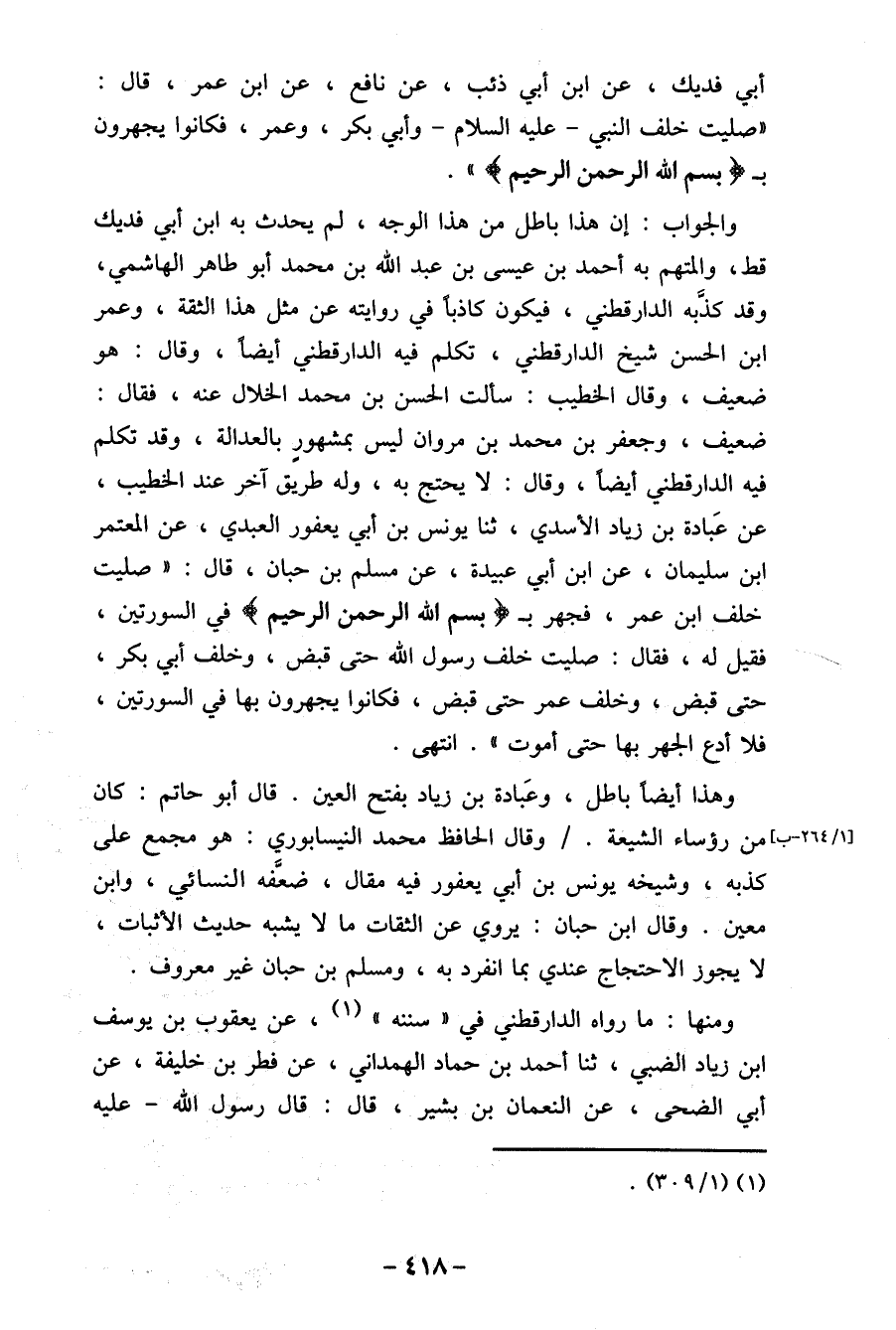والجواب: إن هذا باطل من هذا الوجه، لم يحدث به ابن أبي فديك قط، والمتهم به أحمد بن عيسى بن عبد الله بن محمد أبو طاهر الهاشمي، وقد كذبه الدارقطني، فيكون كاذبا في روايته عن مثل هذا الثقة، وعمر ابن الحسن شيخ الدارقطني، تكلم فيه الدارقطني أيضاً، وقال: هو ضعيف، وقال الخطيب: سألت الحسن بن محمد الخلال عنه، فقال: ضعيف، وجعفر بن محمد بن مروان ليس بمشهور بالعدالة، وقد تكلم فيه الدارقطني أيضاً، وقال: لا يحتج به، وله طريق آخر عند الخطيب، عن عَبادة بن زياد الأسدي، ثنا يونس بن أبي يعفور العبدي، عن المعتمر ابن سليمان، عن ابن أبي عبيدة، عن مسلم بن حبان، قال:، صليت خلف ابن عمر، فجهر ب (بسم الله الرحمن الرحيم) في السورتين، فقيل له، فقال: صليت خلف رسول الله حتى قبض، وخلف أبي بكر، حتى قبض، وخلف عمر حتى قبض، فكانوا يجهرون بها في السورتين، فلا أدع الجهر بها حتى أموت" انتهى.