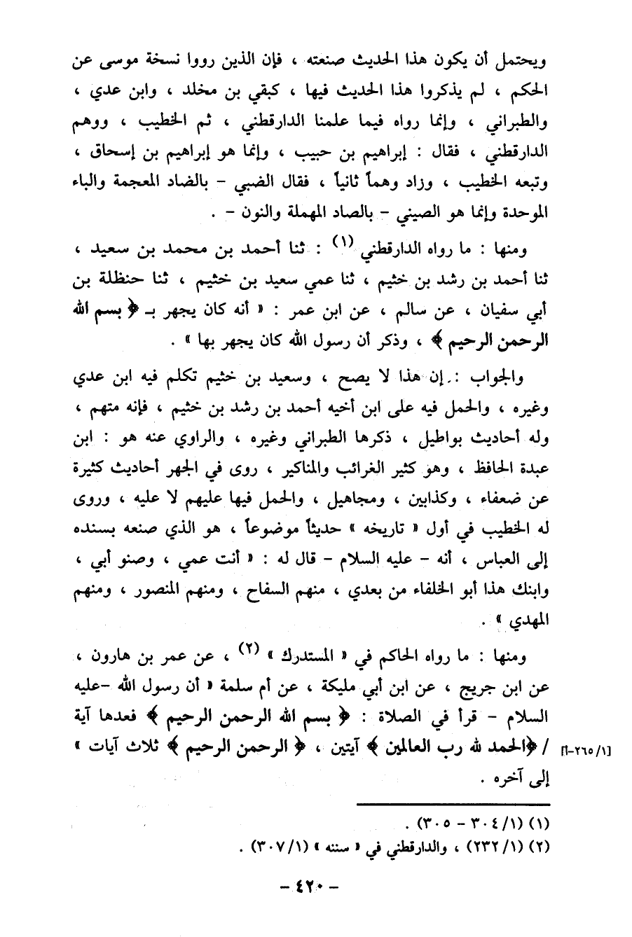 والجواب: إن هذا لا يصح، وسعيد بن خثيم تكلم فيه ابن عدي وغيره، والحمل فيه على ابن أخيه أحمد بن رشد بن خثيم، فإنه متهم، وله أحاديث بواطيل، ذكرها الطبراني وغيره، والراوي عنه هو: ابن عبدة الحافظ، وهو كثير الغرائب والمناكير، روى في الجهر أحاديث كثيرة عن ضعفاء، وكذابين، ومجاهيل، والحمل فيها عليهم لا عليه، وروى له الخطيب في أول " تاريخه " حديثا موضوعا، هو الذي صنعه بسنده إلى العباس، أنه- عليه السلام- قال له:" أنت عمي، وصنو أبي، وابنك هذا أبو الخلفاء من بعدي، منهم السفاح، ومنهم المنصور، ومنهم المهدي"