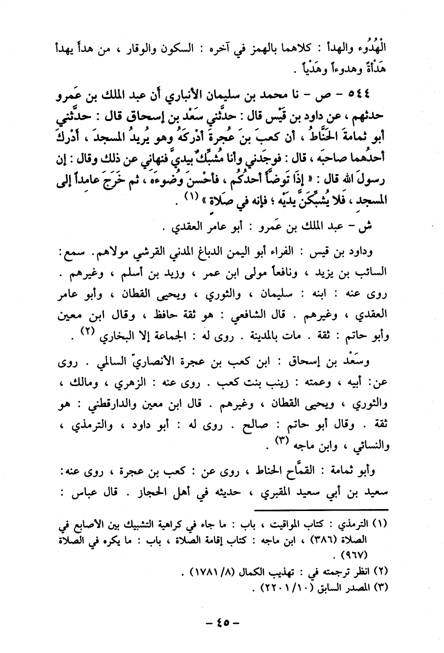544- ص- نا محمد بن سليمان الأنباري أن عبد الملك بن عَمرو حدثهم، عن داود بن قَيْس قال: حدثني سَعْد بن إسحاق قال: حدَّثني أبو ثمامةَ الحَناطُ، أن كعبَ بنَ عُجرةَ أدركَهُ وهو يُريدُ المسجدَ، أدْركَ أحدُهما صاحبَه، قال: فوجَدني وأنا مُشبِّك بيديَّ فنهانِي عن ذلك وقال: إن رسولَ الله قال: " إذَا تَوضأ أحدُكُم، فأحْسنَ وُضوءَه، ثم خَرَجَ عامدا إلى المسجدِ، فَلا يُشبكَنَّ يديه فإنه في صَلاةٍ " (1) .
