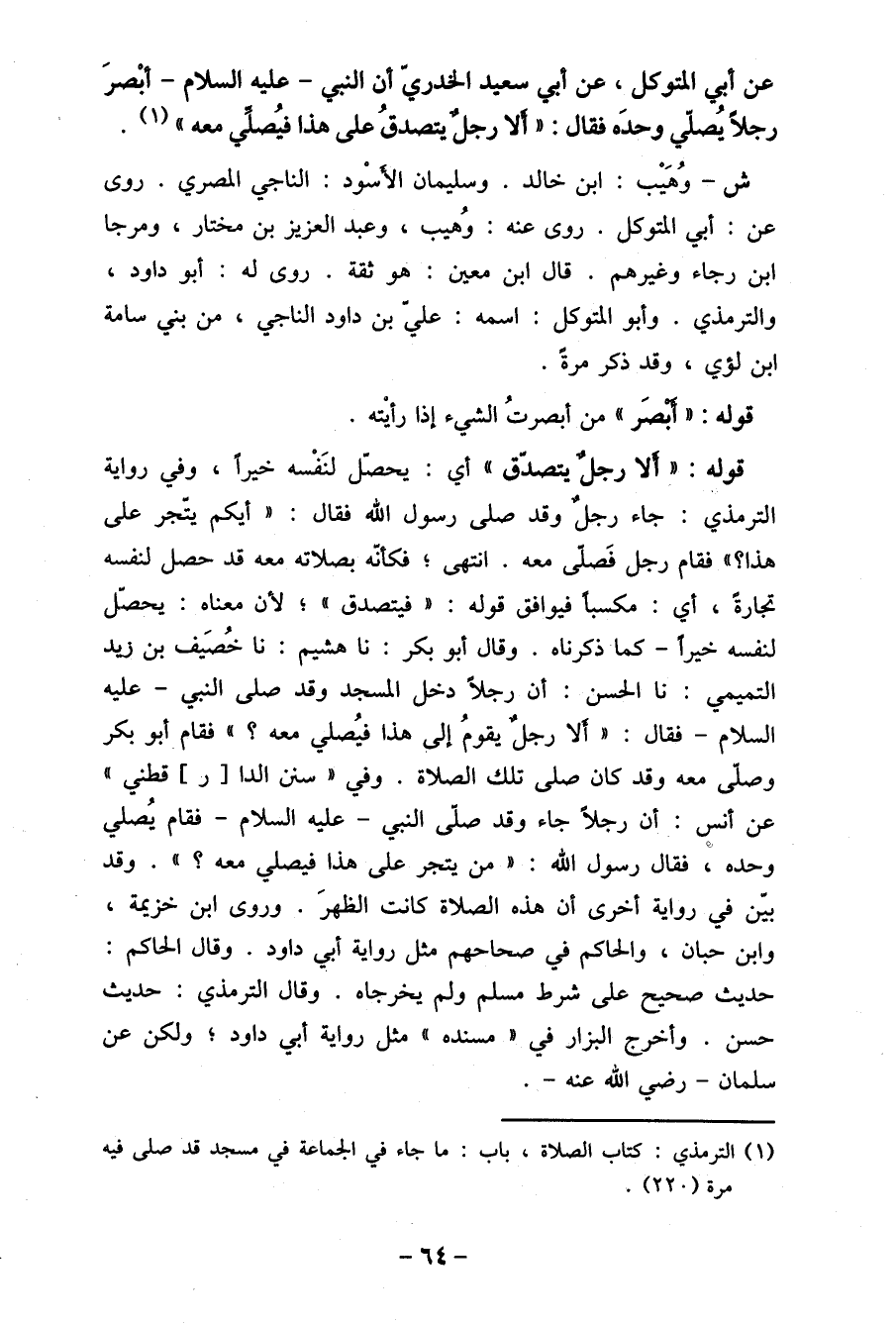 عن أبي المتوكل، عن أبي سعيد الخدري أن النبي- عليه السلام- أبْصرَ رجلاً يُصلّي وحده فقال: " ألا رجل يتصدقُ على هذا فيُصلي معه " (1) . ش- وُهَيْب: ابن خالد. وسليمان الأسْود: الناجي المصري. روى عن: أبي المتوكل. روى عنه: وُهيب، وعبد العزيز بن مختار، ومرجا ابن رجاء وغيرهم. قال ابن معين هو ثقة. روى له: أبو داود، والترمذي. وأبو المتوكل: اسمه: علي بن داود الناجي، من بني سامة ابن لؤي وقد ذكر مرةً.