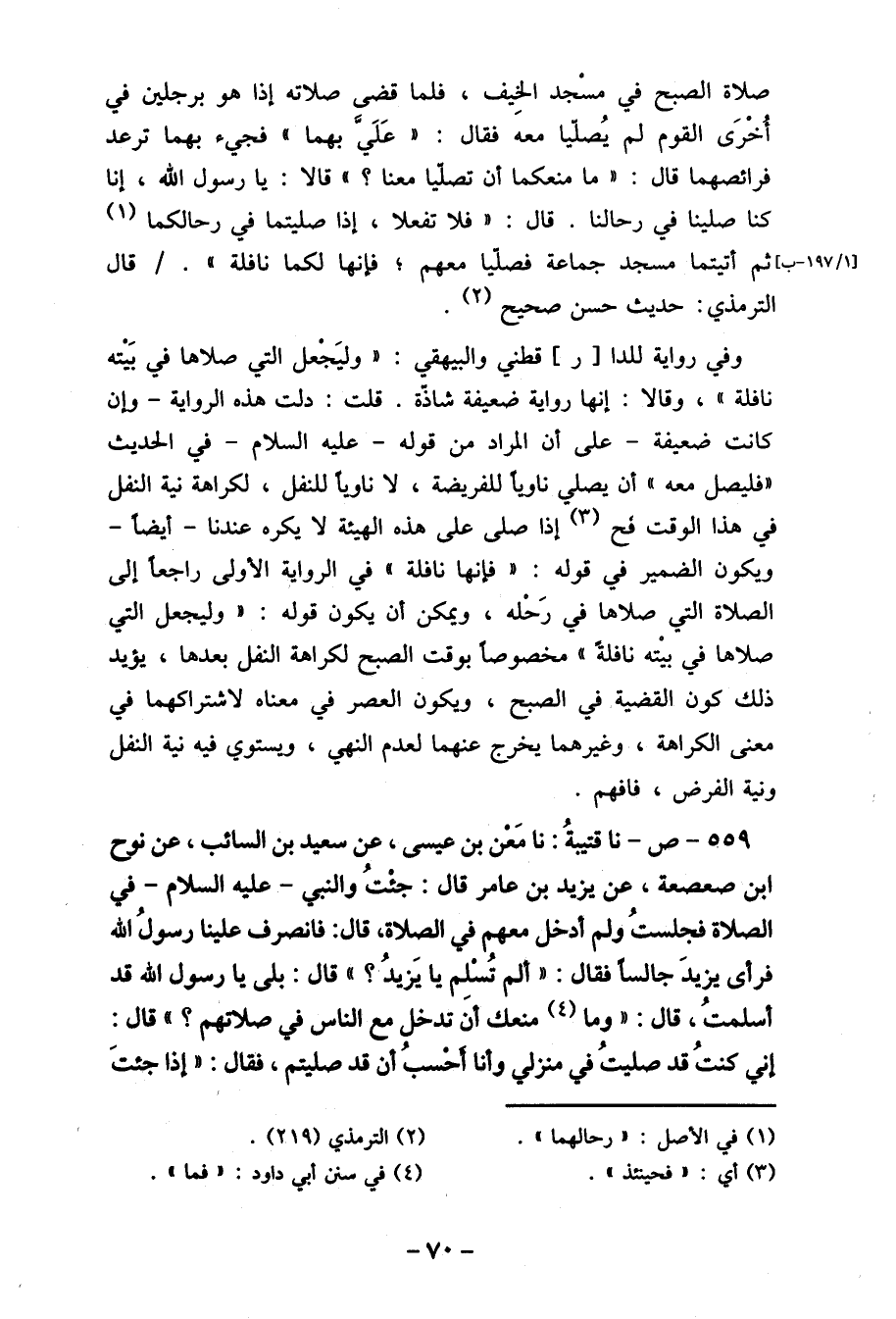 صلاة الصبح في مسْجد الخِيف، فلما قضى صلاته إذا هو برجلين في أخرى القوم لم يُصليا معه فقال:" علي بهما " فجيء بهما ترعد فرائصهما قال: " ما منعكما أن تصليا معنا؟ " قالا: يا رسول الله، إنا كنا صلينا في رحالنا. قال: " فلا تفعلاً، إذا صليتما في [1/197-ب] رحالكما (1) ، ثم أتيتما مسجد جماعة فصليا معهم، فإنها لكما نافلة ". / قال الترمذي: حديث حسن صحيح (2) .