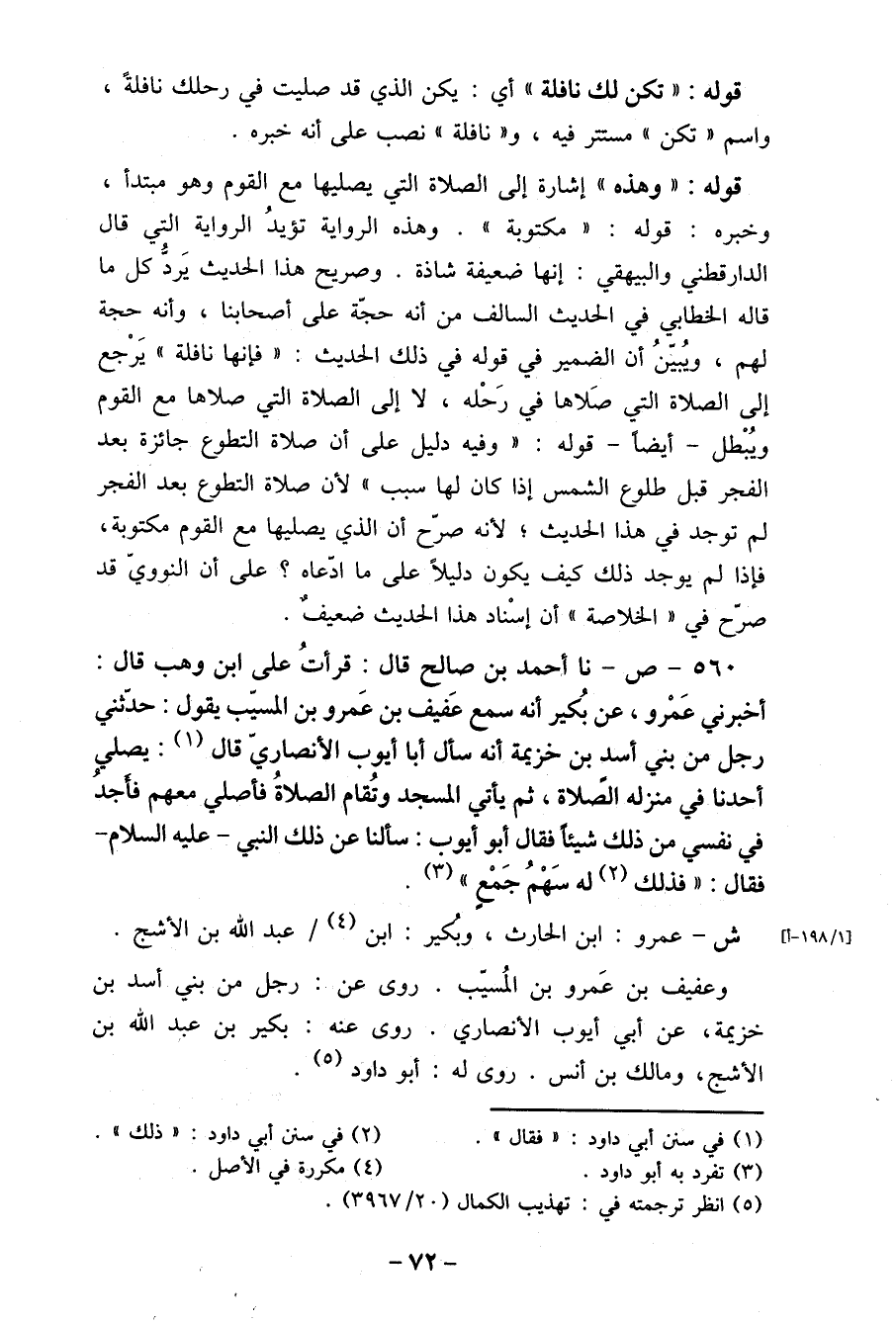 560- ص- نا أحمد بن صالح قال: قرأتُ على ابن وهب قال: أخبرني عَمْرو، عن بُكير أنه سمع عَفيف بن عَمرو بن المسيب يقول: حدثني رجل من بني أسد بن خزيمة أنه سأل أبا أيوب الأنصاري قال (1) : يصلي أحدنا في منزله الصًلاة، ثم يأتي المسجد وتُقام الصلاةُ فأصلي معهم فأجدُ في نفسي من ذلك شيئاً فقال أبو أيوب: سألنا عن ذلك النبي- عليه السلام- فقال: " فذلك (2) له سَهْمُ جَمْعٍ " (3) . [1/198 - أ]