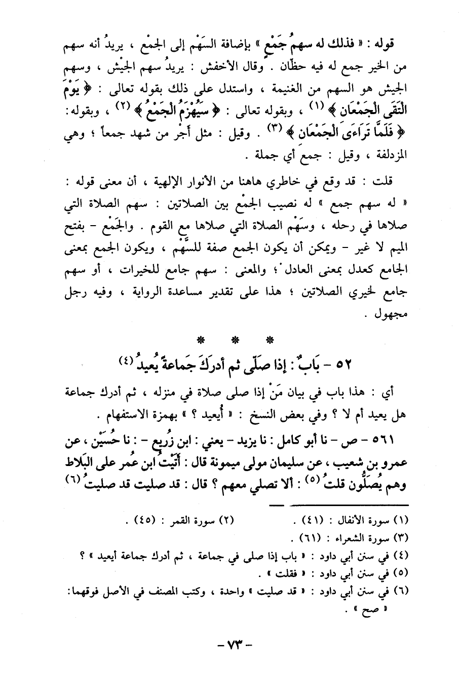 " له سهم جمع " له نصيب الجمْع بين الصلاتين: سهم الصلاة التي صلاها في رحله، وسَهْم الصلاة التي صلاها مع القوم. والجَمْع- بفتح الميم لا غير- ويمكن أن يكون الجمع صفة للسهْم، ويكون الجمع بمعنى الجامع كعدل بمعنى العادلْ، والمعنى: سهم جامع للخيرات، أو سهم جامع لخيري الصلاتين، هذا على تقدير مساعدة الرواية، وفيه رجل مجهول.