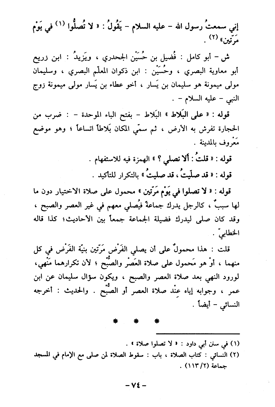 إني سمعتُ رسول الله- عليه السلام- يَقُولُ: " لا تُصلوا (1) في يَوْم مَرتين " (2) .
