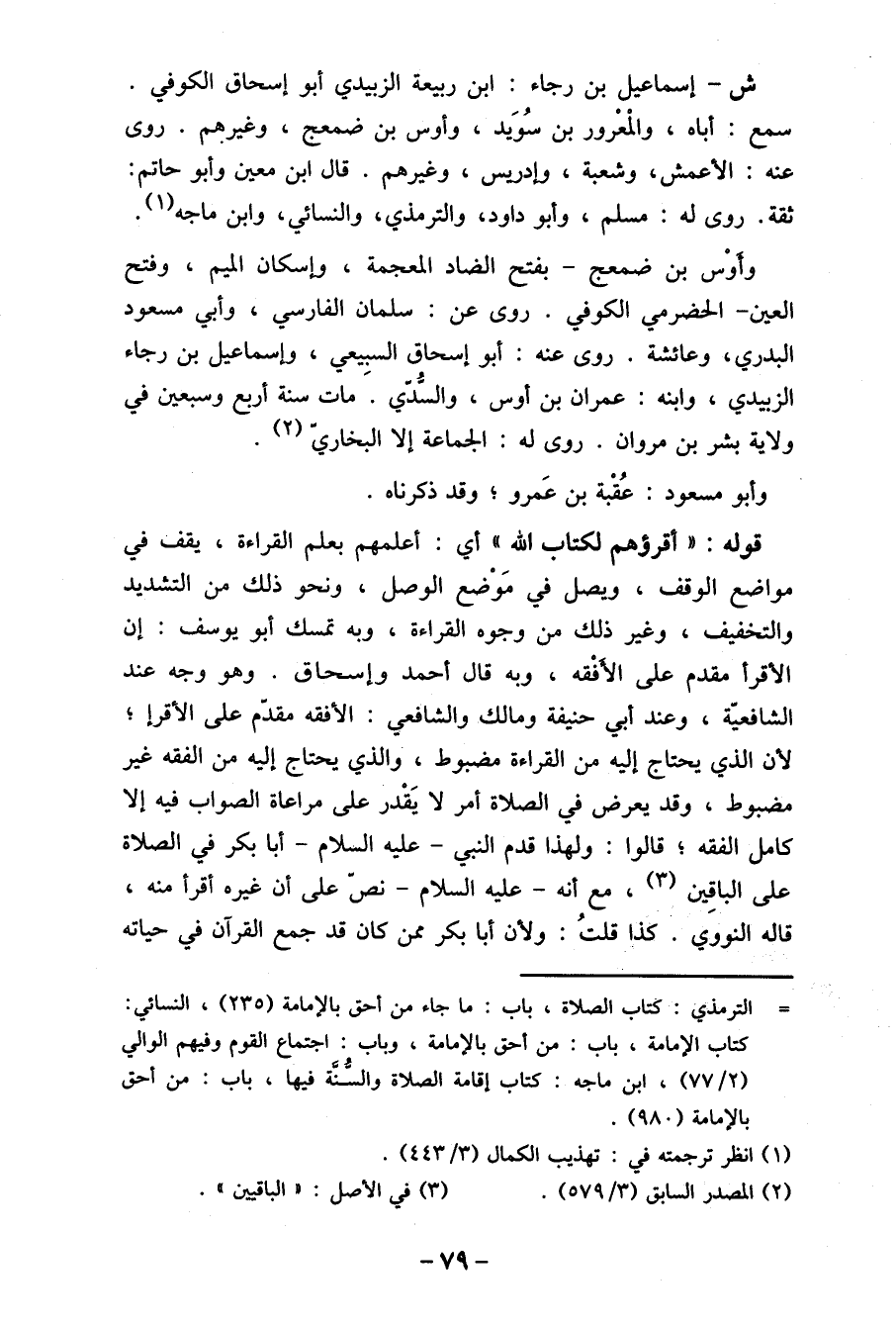 ش- إسماعيل بن رجاء: ابن ربيعة الزبيدي أبو إسحاق الكوفي. سمع: أباه، والمْعْرور بن سُوَيد، وأوس بن ضمعج، وغيرهم. روى عنه: الأعمش، وشعبة، وإدريس، وغيرهم. قال ابن معين وأبو حاتم: ثقة. روى له: مسلم، وأبو داود، والترمذي، والنسائي، وابن ماجه (1) . وأوْس بن ضمعج- بفتح الضاد المعجمة، وإسكان الميم، وفتح العين- الحضرمي الكوفي. روى عن، سلمان الفارسي، وأبي مسعود البدري، وعائشة. روى عنه: أبو إسحاق السبيعي، وإسماعيل بن رجاء الزبيدي، وابنه: عمران بن أوس، والسُدي. َ مات سنة أربع وسبعن في ولاية بشر بن مروان. روى له: الجماعة إلا البخاري (2) .