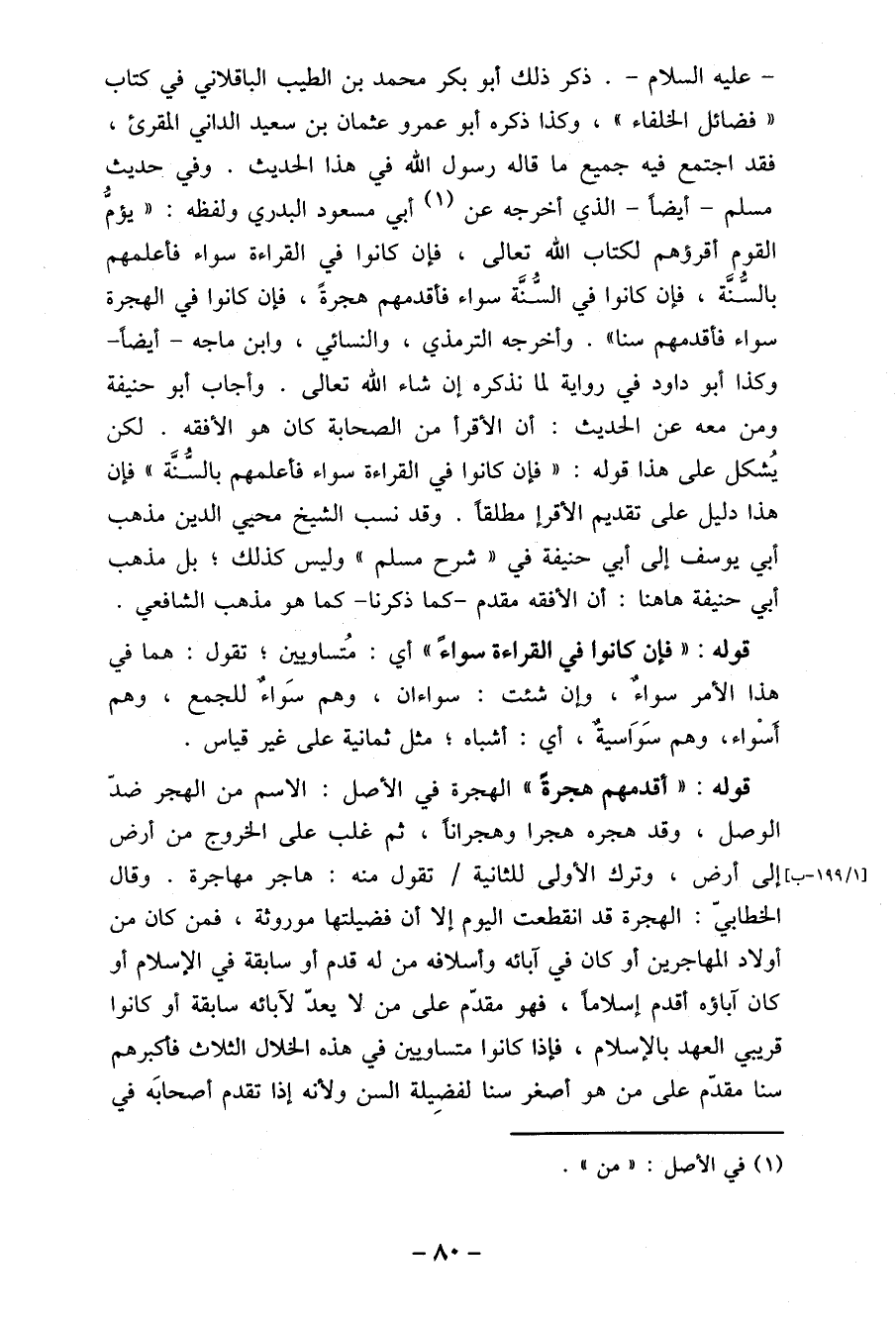 بالسُّنَّة، فإن كانوا في السُنَة سواء فأقدمهم هجرةً، فإن كانوا في الهجرة