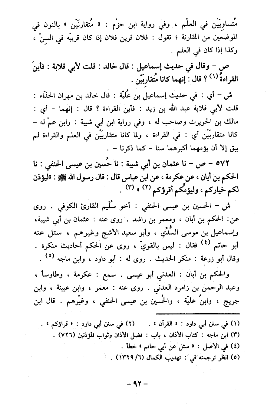(1) في سنن أبي داود: " القرآن ". (2) في حق أبي داود:" قراؤكم ". (3) ابن ماجه: كتاب الأذان، باب: فضل الأذان وثواب المؤذنين (726) . (4) في الأصل: "سئل عن أبي حاتم " خطأ.