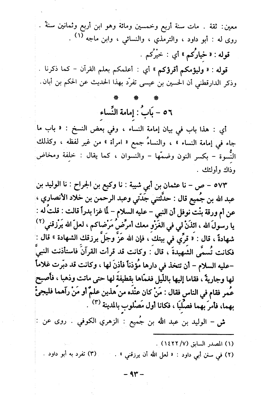 573- ص- نا عثمان بن أبي شيبة: نا وكيع بن الجراح: نا الوليد بن عبد الله بن جُميع قال: حدَّثتني جَدتي وعبد الرحمن بن خلاد الأنصاري، عن أم ورقة بنْت نوفل أن النبي- عليه السلام- لما غزا بدراَ قالت: قلتُ له: يا رسولَ الله، ائذنْ لي في الغَزْوِ معك أمر ض مَرْضاكم، لعل الله يَرْزقني (2) شهادةَ، قال: " قري في بيتك، فإن الله عَز وجَل يرزقك الشهادة " قال: فكانت تُسمى الشَهيدةَ، قالَ: وكانت قد قرأت القرآنً فاستأذنت النبي - عليه السلام- أن تتخذ في دارها مُؤذناً فأذنَ لها، وكانت قد دبرت غلاماً لها وجاريةَ، فقاما إليها بالليِل فغماها بقطيفةَ لها حتى ماتت وذهبا، فأصبح عُمر فقام في الناس فقال: منْ كان عنْدَه منَ هذين علم أو مَنْ رآهما فليجئْ بهما، فأمرَ بهما فصلِبَا، فكانا أول مَصْلوبِ بالمدينة (3) .