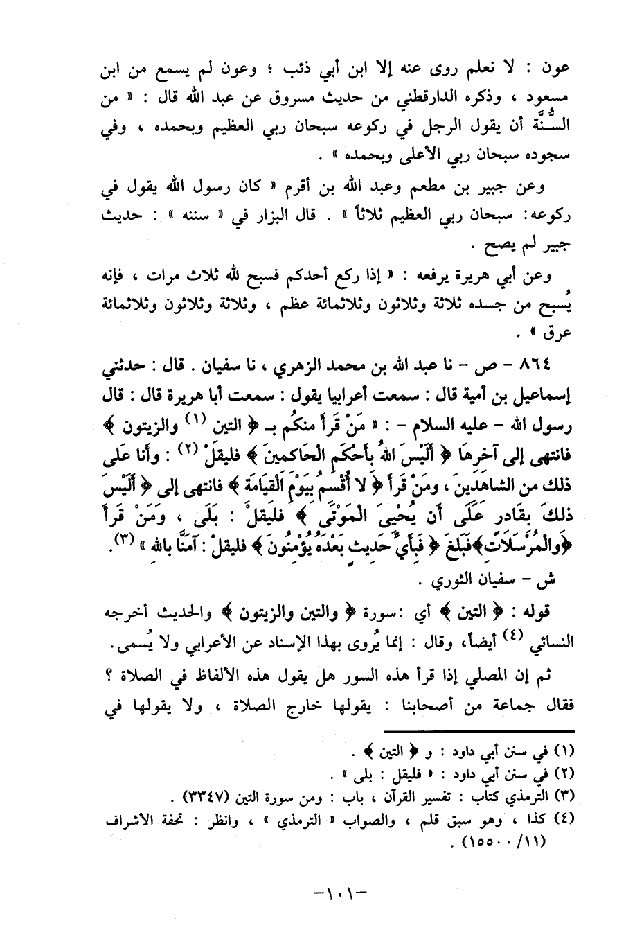 864-ص- نا عبد الله بن محمد الزهري، نا سفيان. قال: حدثني إسماعيل بن أمية قال: سمعت أعرابيا يقول: سمعت أبا هريرة قال: قال رسول الله- عليه السلام-:" مَنْ قَرأ منكُم بـ "التين (1) والزيتون " فانتهى إلى آخرها ألَيْسَ اللهُ بأحكَم الحَاكمينَ " فليقل (2) : وأنا عَلى ذلك من الشاهدينَ، ومًنْ قَرأ "لا أقْسمُ بيَوم القيَامَةِ" فانتهى إلى "ألَيْسَ ذلكَ بقَادرِ بقادر على أن يُحْيىَ المَوْتَى" فليَقلْ: بَلَى، وَمَنْ قَرأ "والمُرسَلاَتِ " فَبَلغَ "فَبِأي حديث بَعْدَهُ يُؤْمِنُونَ " فليقلْ: "آمَنَا باللهِ " (3) . ش- سفيان الثوري.