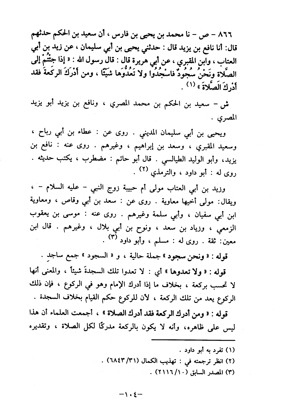 866- ص- نا محمد بن يحيى بن فارس، أن سعيد بن الحكم حدثهم قال: نا نافع بن يزيد قال: حدثني يحيى بن أبي سليمان، عن زيد بن أبي العتاب، وابن المقبري، عن أبي هريرة قال: قال رسول الله: "إذا جئتُم إلى الصلاة ونَحْنُ سُجُود فاسْجُدُوا ولا تَعُدوَها شَيْئًا، ومن أدرَكَ الركَعة فقد أدْركَ الَصَلاةَ " (1) .