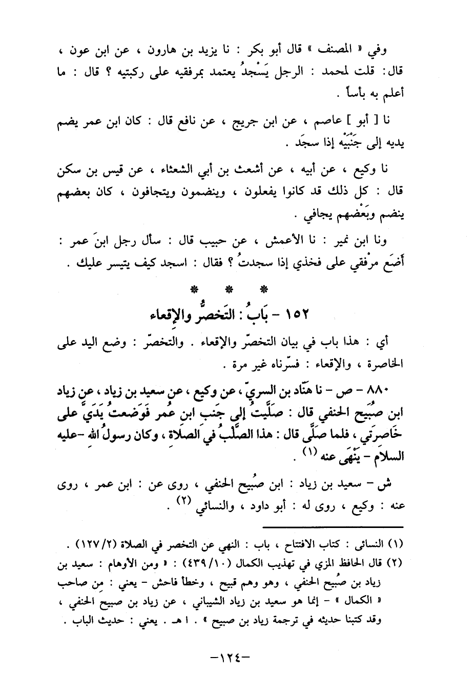 880 - ص- نا هناد بن السري، عن وكيع، عن سعيد بن زياد، عن زياد ابن صُبَيح الحنفي قال: صَلَّيتُ إلى جَنب ابنِ عُمر فَوَضعتُ يَدَيَّ على خَاصرَتي، فلما صَلَّى قال: هذا الصَّلبُ فيَ الصلاة، وكان رسولُ الله- عليه السلاَم- يَنْهَى عنه (1) .