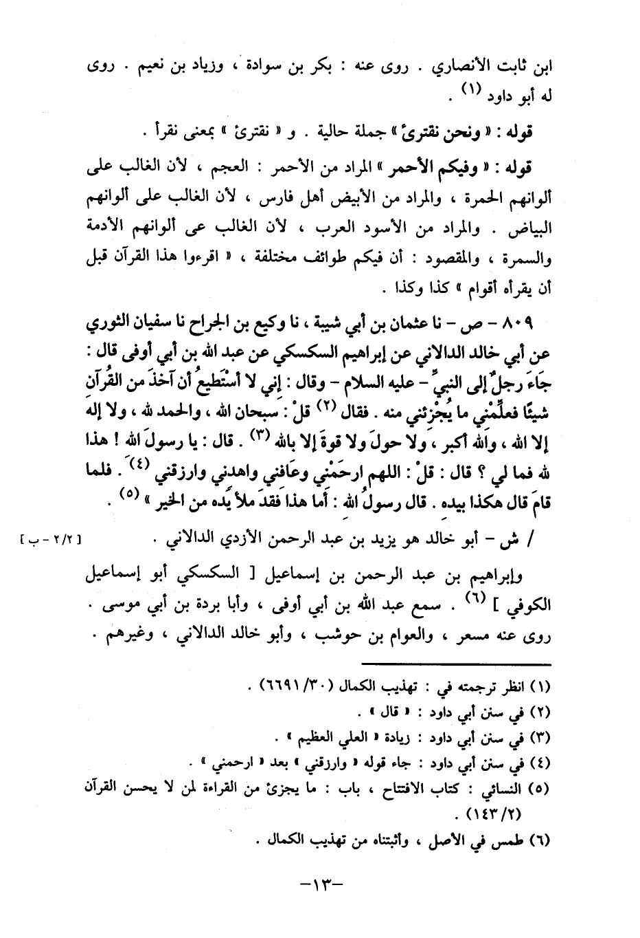 809- ص- نا عثمان بن أبي شيبة، نا وكيع بن الجراح نا سفيان الثوري عن أبي خالد الدالاني عن إبراهيم السكسكي عن عبد الله بن أبي أوفى قال: جَاءَ رجل إلى النبي- عليه السلام- وقال: إِني لا أسْتَطيعُ أن اَخذَ من القُراَن شيئًا فعلمني ما يُجْزئني منه. فقال (2) قلْ: سبحان الله، والحمد لله، ولا إلهَ إلا الله، والله كبر، َ ولا حولَ ولا قوةَ إلا بالله (3) . قال: يا رسولَ الله هذا لله فما لي؟ قال: قلْ: اللهم ارحَمْني وعَافني واهدني وارزقني (4) . فلما قامَ قال هكذا بيدهِ. قال رسولُ اللهِ: أَما هذا فَقدَ ملأ يده من الخير" (5) .