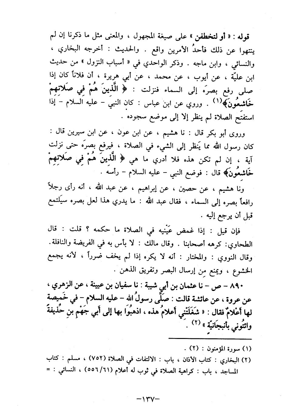 (2) البخاري: كتاب الأذان، باب: الالتفات في الصلاة (752) ، مسلم: كتاب المساجد، باب: كراهية الصلاة في ثوب له أعلام (61/ 556) ، النسائي:=