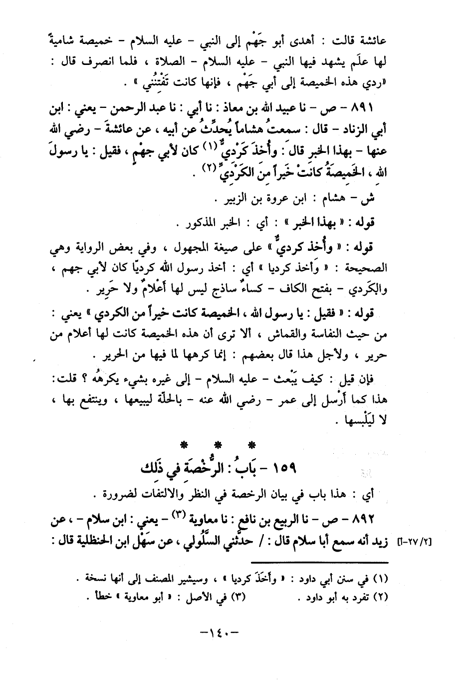 891- ص- نا عبيد الله بن معاذ: نا أبي: نا عبد الرحمن- يعني: ابن أبي الزناد- قال: سمعتُ هشاما يُحدثُ عن أبيه، عن عائشةَ- رضي الله عنها- بهذا الخبرِ قالَ: وأخذَ كَرْدي (1) كان لأبي جهْمِ، فقيل: يا رسولَ الله، الخَمِيصَةُ كانتْ خيرا مِنَ الكَردي (2) .