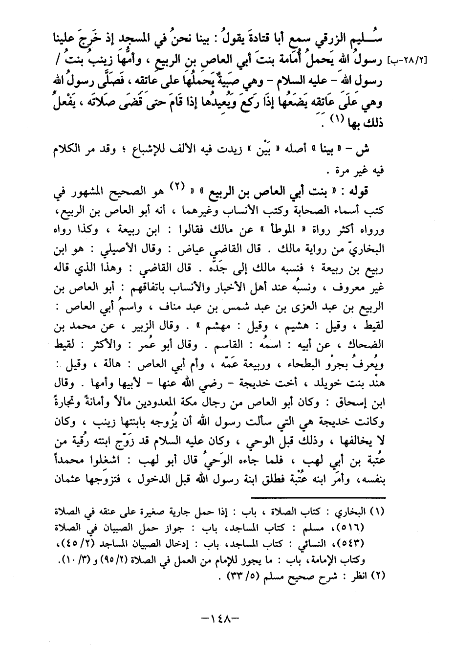 سُليم الزرقي سمع أبا قتادةَ يقولُ: بينا نحنُ في المسجد إذ خَرجَ علينا [2/ 28 - ب] ، رسولُ الله يَحملُ أمَامة بنتَ أبي العاصِ بنِ الربيع، وأمُهاَ زينبُ بنتُ/ رسول اللهَ- عليه السلام- وهي صَبية يَحملُها على عاتِقه، فَصلي رسولُ الله