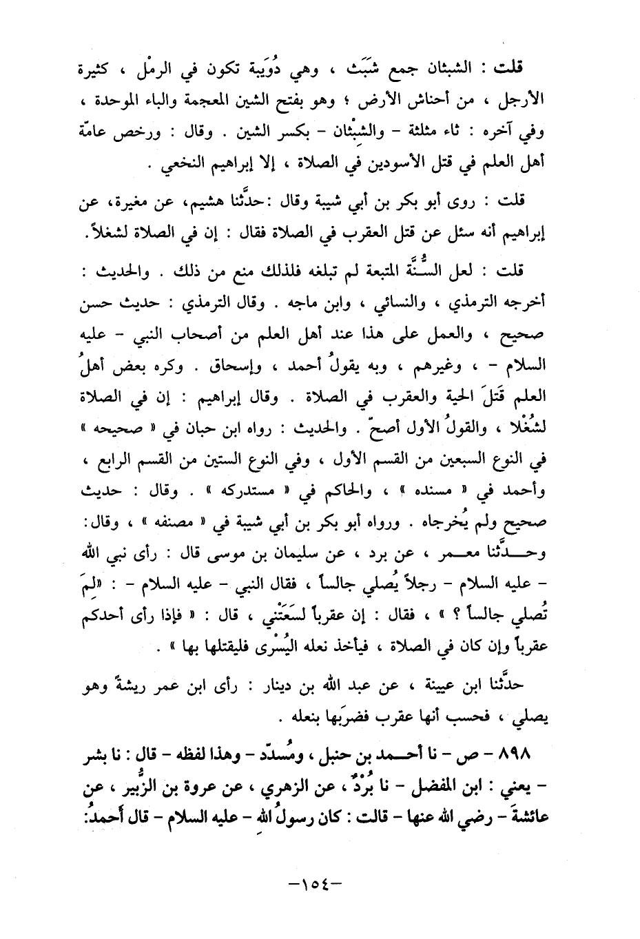 حدَّثنا ابن عيينة، عن عبد الله بن دينار: رأى ابن عمر ريشة وهو يصلي، فحسب أنها عقرب فضرَبها بنعله.