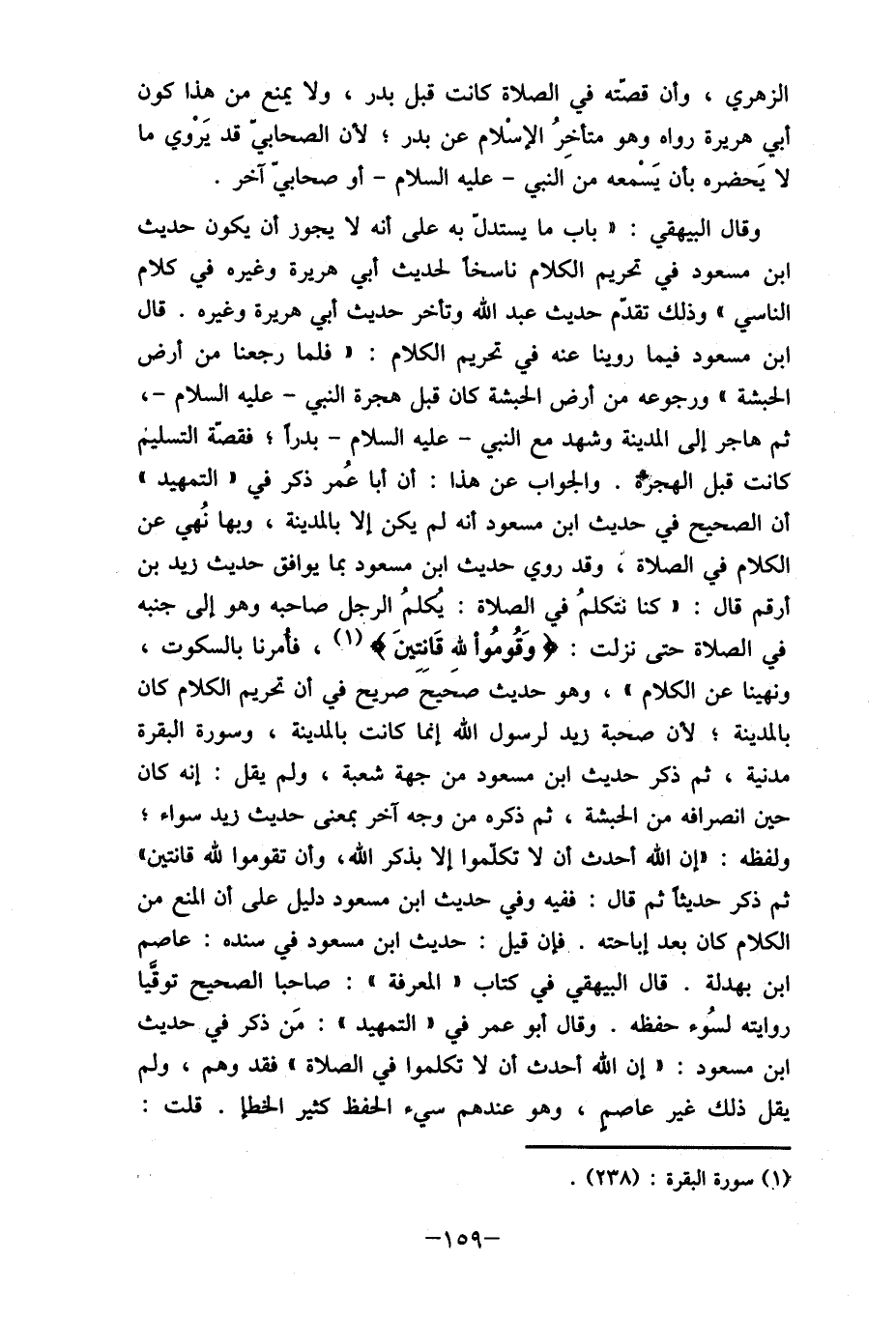 وقال البيهقي: "باب ما يستدل به على أنه لا يجور أن يكون حديث ابن مسعود في تحريم الكلام ناسخا لحديث أبي هريرة وغيره في كلام الناسي" وذلك تقدم حديث عبد الله وتأخر حديث أبي هريرة وغيره. قال ابن مسعود فيما روينا عنه في تحريم الكلام: "فلما رجعنا من أرض الحبشة، ورجوعه من أرض الحبشة كان قبل هجرة النبي- عليه السلام-، ثم هاجر إلى المدينة وشهد مع النبي- عليه السلام- بدرا، فقصة التسليم كانت قبل الهجرة. والجواب عن هذا: أن أبا عُمر ذكر في "التمهيد " أن الصحيح في حديث ابن مسعود أنه لم يكن الا بالمدينة، وبها نُهي عن الكلام في الصلاة، وقد روي حديث ابن مسعود بما يوافق حديث زيد بن أرقم قال: "كنا نتكلمُ في الصلاة: يكلمُ الرجل صاحبه وهو إلى جنبه في الصلاة حتى نزلت: "وَقُومُوا لله قانتين " (1) ، فأُمرنا بالسكوت، ونهينا عن الكلام "، وهو حديث صحيح صريح في أن تحريم الكلام كان بالمدينة؛ لأن صحبة زيد لرسول الله إنما كانت بالمدينة، وسورة البقرة مدنية، ثم ذكر حديث ابن مسعود من جهة شعبة، ولم يقل: إنه كان حين انصرافه من الحبشة، ثم ذكره من وجه آخر بمعنى حديث زيد سواء؛ ولفظه: "إن الله أحدث أن لا تكلموا الا بذكر الله، وأن تقوموا لله قانتين، ثم ذكر حديثا ثم قال: ففيه وفي حديث ابن مسعود دليل على أن المنع من الكلام كان بعد إباحته. فإن قيل: حديث ابن مسعود في سنده: عاصم ابن بهدلة. قال البيهقي في كتاب "المعرفة": صاحبا الصحيح توقيا روايته لسُوء حفظه. وقال أبو عمر في "لتمهيد ": مَن ذكر في حديث ابن مسعود: "إن الله أحدث أن لا تكلموا في الصلاة " فقد وهم، ولم يقل ذلك غير عاصم، وهو عندهم سيء الحفظ كثير الخطأ. قلت: