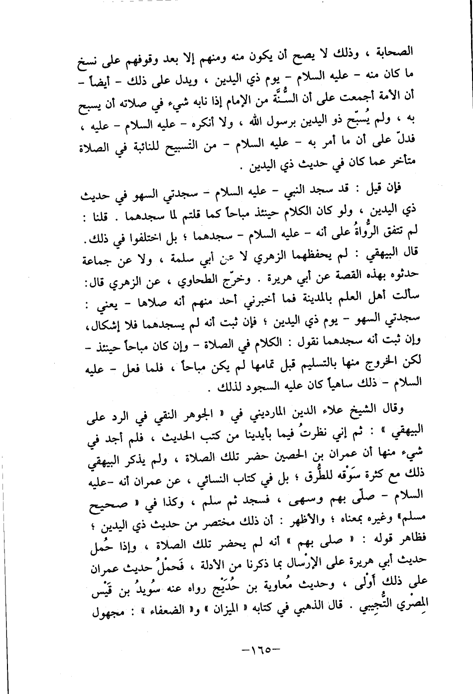 وقال الشيخ علاء الدين المارديني في "الجوهر النقي في الرد على البيهقي": ثم إني نظرتُ فيما بأيدينا من كتب الحديث، فلم أجد في شيء منها أن عمران بن الحصين حضر تلك الصلاة، ولم يذكر البيهقي ذلك مع كثرة سَوْقه للطُرق؛ بل في كتاب النسائي، عن عمران أنه- عليه السلام- صلي بهم وسهى، فسجد ثم سلم، وكذا في "صحيح مسلم " وغيره بمعناه؛ والأظهر: أن ذلك مختصر من حديث ذي اليدين؛ فظاهر قوله: مصلى بهم " أنه لم يحضر تلك الصلاة، وإذا حُمل حديث أبي هريرة على الإرْسال بما ذكرنا من الأدلة، فَحمْلُ حديث عمران على ذلك أوْلى، وحديث مُعاوية بن حُدَيْج رواه عنه سُويدُ بن قَيْس المِصْري التُجِيبي. قال الذهبي في كتابه " الميزان" و "الضعفاء": مجهول