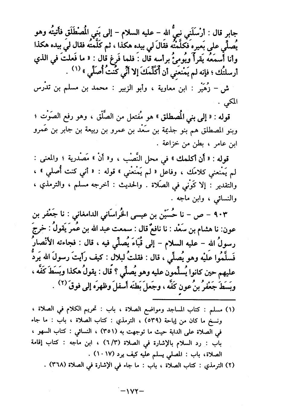 903- ص- نا حُسَيْن بن عيسى الخُراسَاني الدامغاني: نا جَعْفر بن عون: نا هشام بن سَعْد: نا نافع قال: سمعت عبد الله بن عُمرَ يَقولُ: خرجَ رسولُ الله- عليه السلام- إلى قُبَاءَ يُصلِّي فيه، قال: فجاءته الأنْصار فَسلَّمُوا عَليْه وهو يُصلي، قال: فقلتُ لبلال: كيف رَأيتَ رسولَ الله يَرد عليهم حين كانوا يُسلِّمون عليه وهو يصلي؟ قَال: يقولُ هكذا وبَسَطَ كَفَّه، وبَسَطَ جَعْفرُ بنُ عونٍ كَفَّه، وجَعلاَ بَطنَه أسفلَ وظهرَه إلى فوقَ (2) .