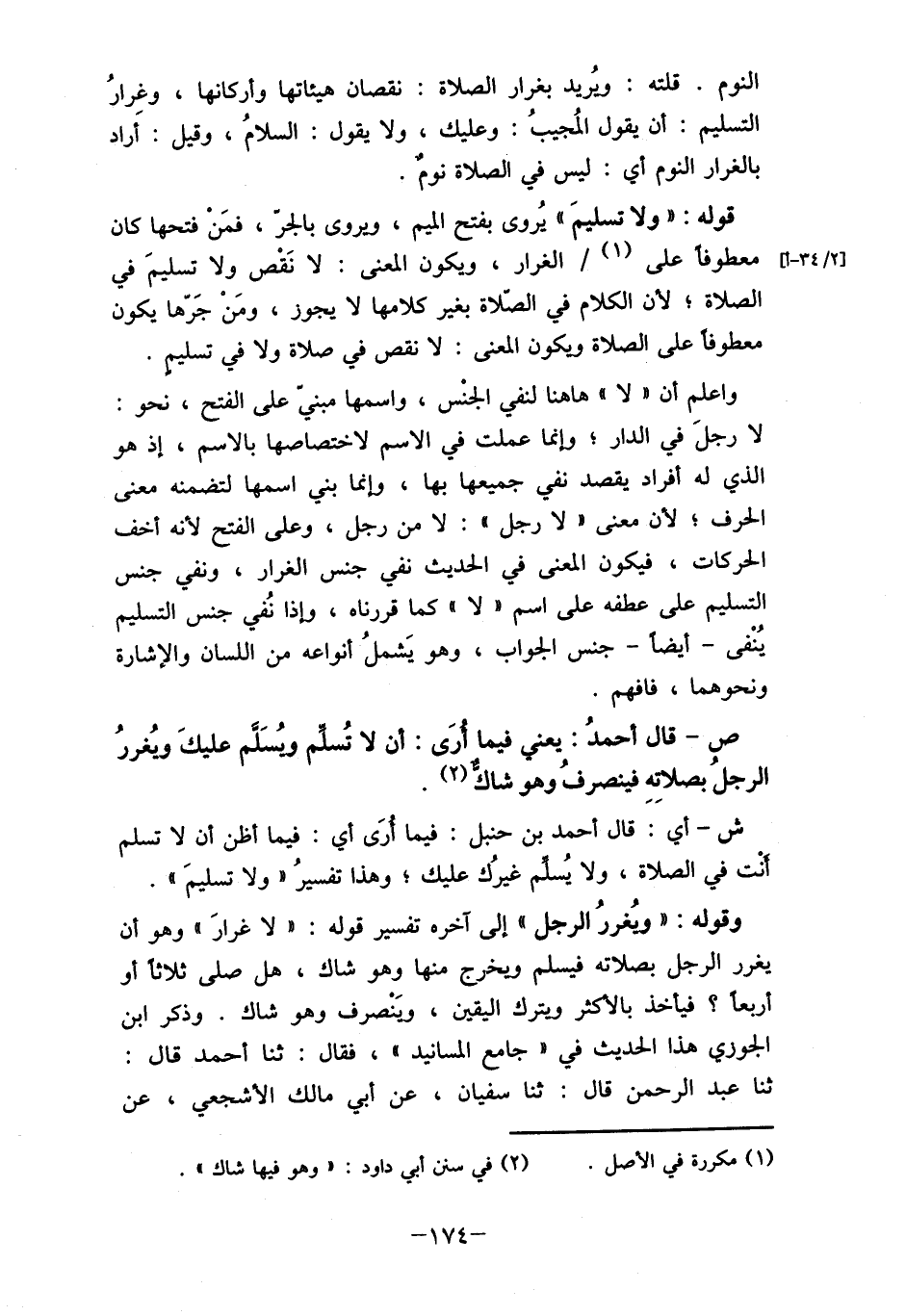 ص- قال أحمدُ: يعني فيما أرَى: أن لا تُسلم ويُسَلم عليكَ ويُغررُ الرجلُ بصلاِتهِ فينصرفُ وهو شاك (2) .
